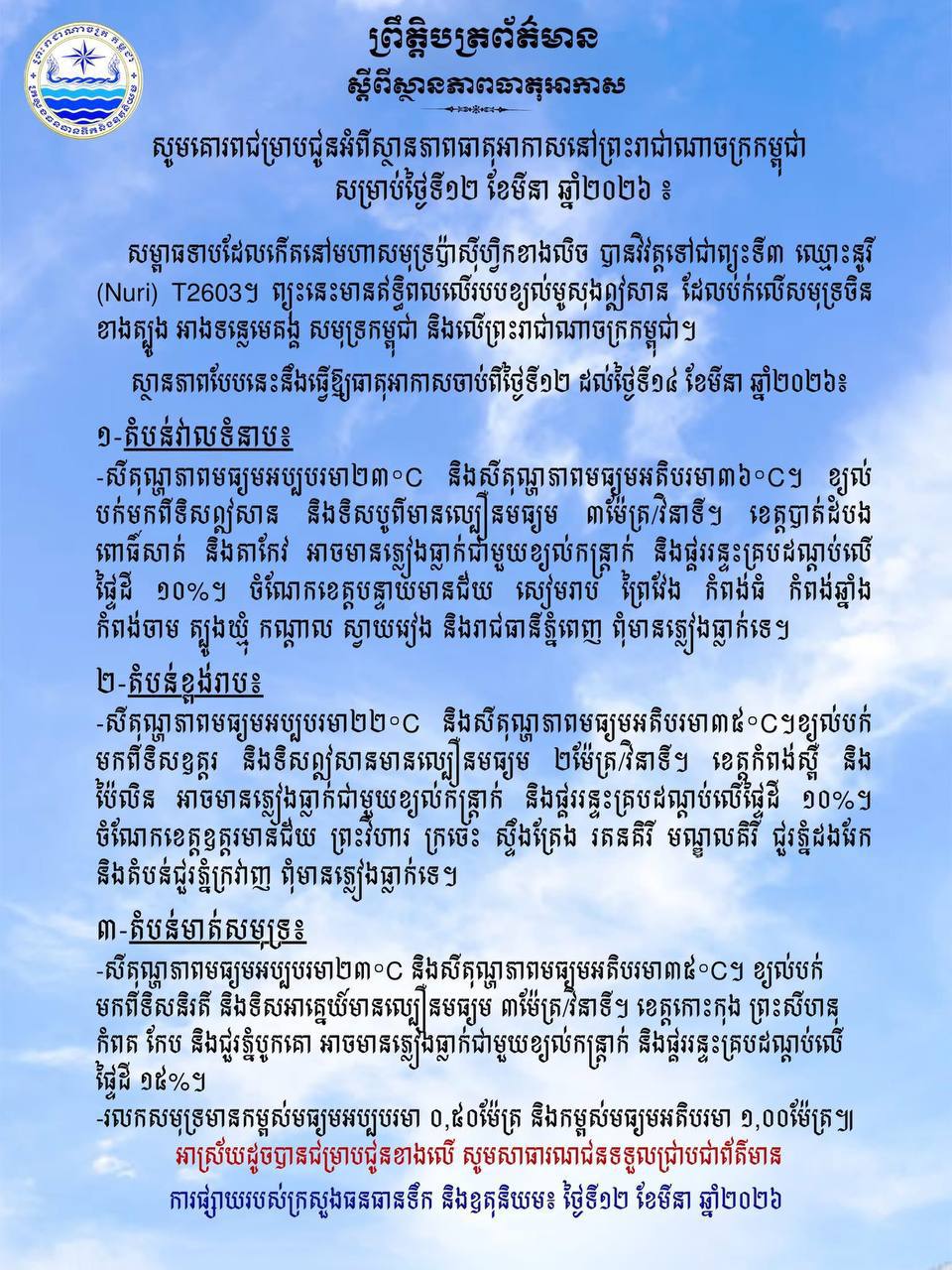 ភ្នំពេញ៖ ក្រសួងធនធានទឹក និងឧតុនិយម នៅព្រឹកថ្ងៃទី១២ ខែមីនា ឆ្នាំ២០២៦នេះ បានចេញសេចក្ដីជូនដំណឹងស្តីពីស្ថានភាពធាតុអាកាសនៅព្រះរាជាណាចក្រកម្ពុជា ខណៈសម្ពាធទាបដែលកើតនៅមហាសមុទ្រប៉ាស៊ីហ្វិកខាងលិច បានវិវត្តទៅជាព្យុះទី៣ ឈ្មោះនូរី (Nuri) T2603។