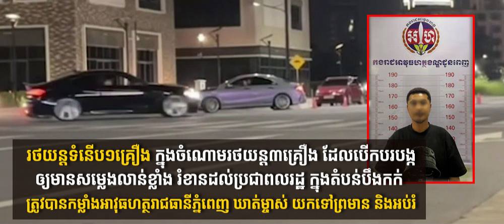 ភ្នំពេញ៖ ដោយមានការផ្តល់ព័ត៌មានពីប្រជាពលរដ្ឋ តាមរយៈលេខទូរស័ព្ទបន្ទាន់ ១២៩១ ដើម្បីសុំកិច្ចអន្តរាគមន៍លើករណីរថយន្តចំនួន៣គ្រឿង បានបំពាក់បំពង់ស៊ីម៉ាំងកែច្នៃ បើកបរបង្កសម្លេងលាន់លឺខ្លាំង រំខានដល់ប្រជាពលរដ្ឋ នៅចំណុចភូមិ១ (តំបន់បឹងកក់) សង្កាត់ស្រះចក ខណ្ឌដូនពេញ រាជធានីភ្នំពេញ នាវេលាម៉ោង០១៖៤៥នាទីយប់ ថ្ងៃទី១១ ខែមីនា ឆ្នាំ២០២៦ កម្លាំងអាវុធហត្ថរាជធានីភ្នំពេញ ក្នុងខណ្ឌដូនពេញ បានចុះដល់ទីតាំងធ្វើការស្រាវជ្រាវ រហូតឃាត់បានរថយន្តមួយគ្រឿងម៉ាក MERCEDES ពាក់ស្លាកលេខកម្ពុជា MENG.AMG នៅចំណុចស្តុបពេទ្យចិន សង្កាត់ចតុមុខ ខណ្ឌដូនពេញ រាជធានីភ្នំពេញ រួមទាំងម្ចាស់ឈ្មោះ ជឹម ចាន់ កែ ភេទប្រុស អាយុ៣៤ឆ្នាំ។
