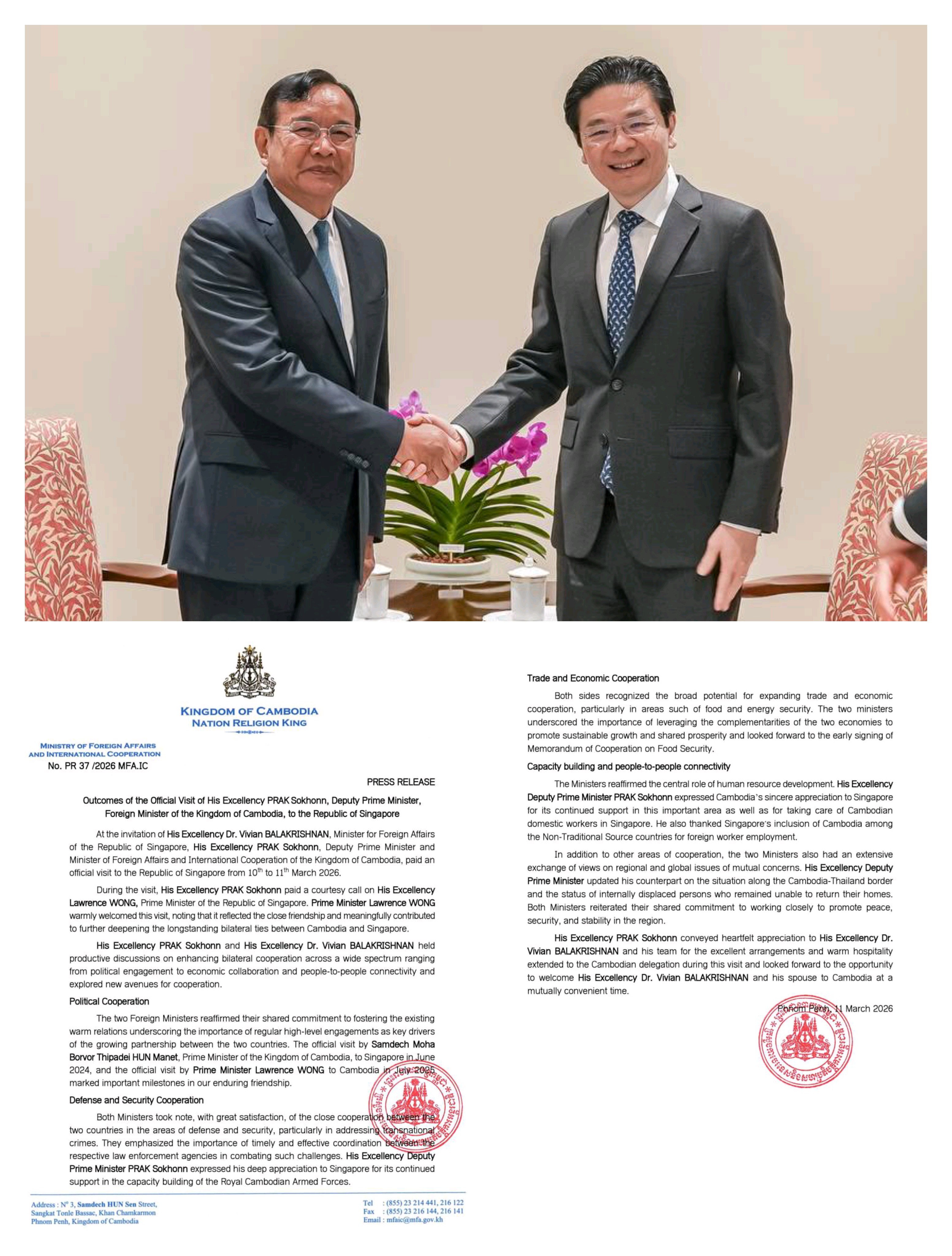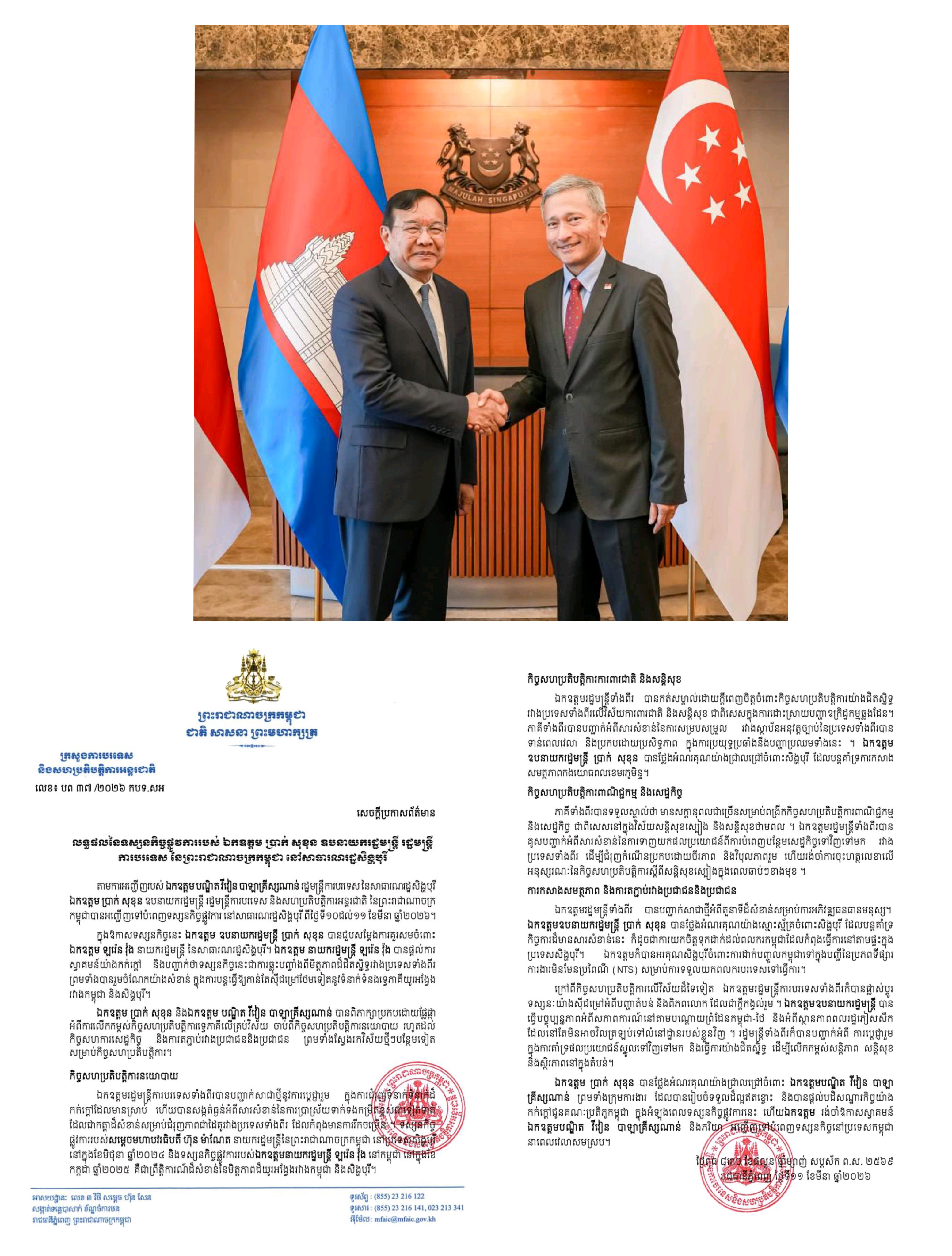 ភ្នំពេញ៖ ក្រសួងការបរទេស និងសហប្រតិបត្តិការអន្តរជាតិ បានឱ្យដឹងនៅព្រឹកទី១២ ខែមីនា ឆ្នាំ២២៦នេះថា៖ តាមការអញ្ជើញរបស់ លោក បណ្ឌិតវីវៀន បាឡាគ្រឹស្សណាន់ រដ្ឋមន្ត្រីការបរទេសនៃសាធារណរដ្ឋសិង្ហបុរី លោក ប្រាក់ សុខុន ឧបនាយករដ្ឋមន្ត្រី រដ្ឋមន្ត្រីការបរទេស និងសហប្រតិបត្តិការអន្តរជាតិ នៃព្រះរាជាណាចក្រកម្ពុជា បានអញ្ជើញទៅបំពេញទស្សនកិច្ចផ្លូវការ នៅសាធារណរដ្ឋសិង្ហបុរី ពីថ្ងៃទី១០ ដល់១១ ខែមីនា ឆ្នាំ២០២៦។