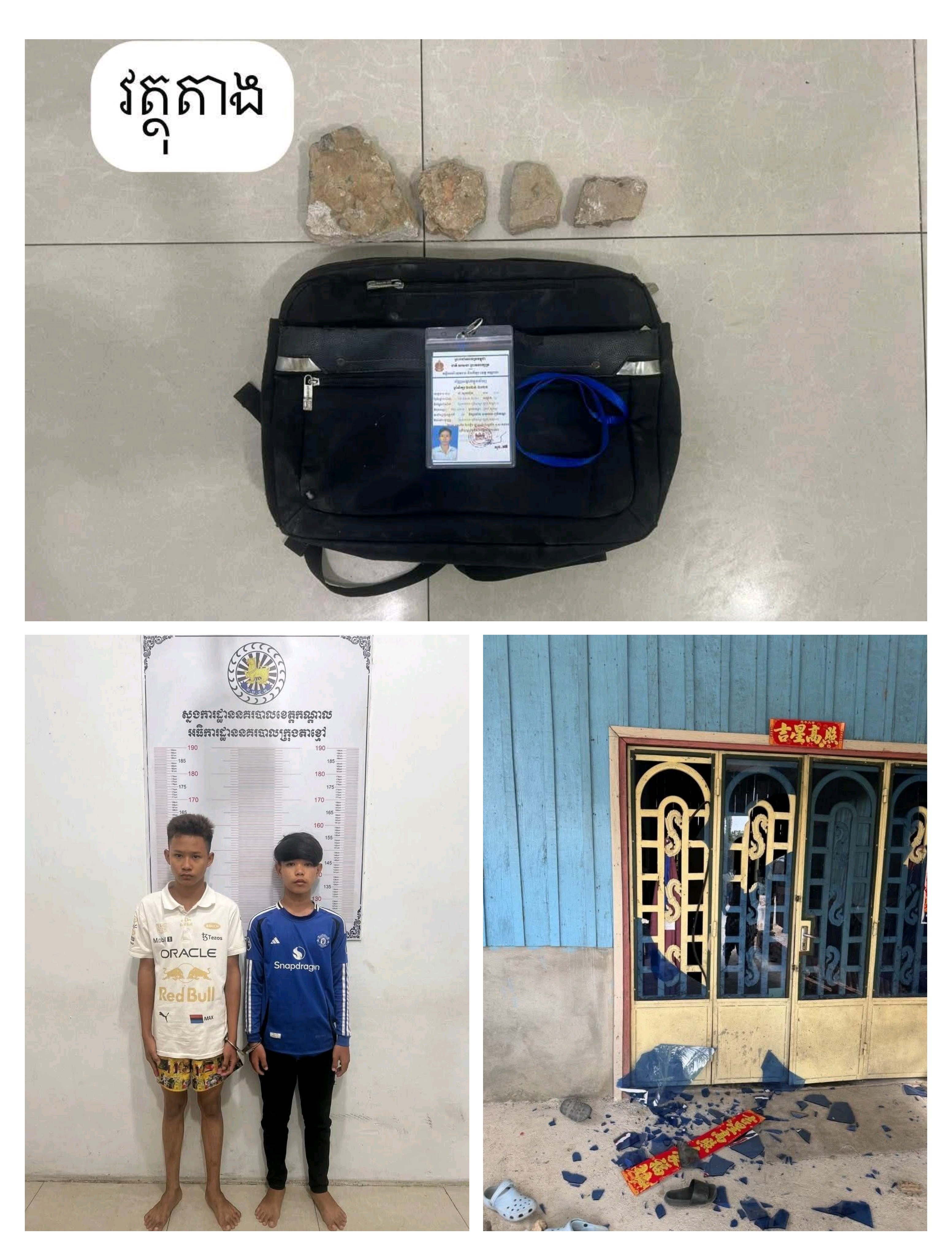 វត្ថុតាងចាប់យកកាបូបពណ៍ខ្មៅចំនួន០១,ដុំថ្មចំនួន ០៤ដុំ, កាតសិស្សចំនួន០១។