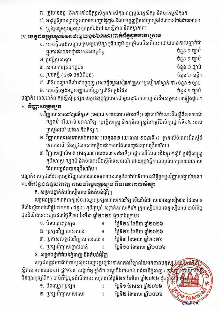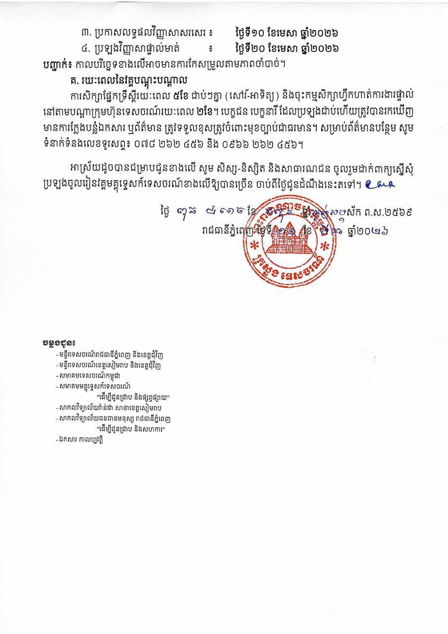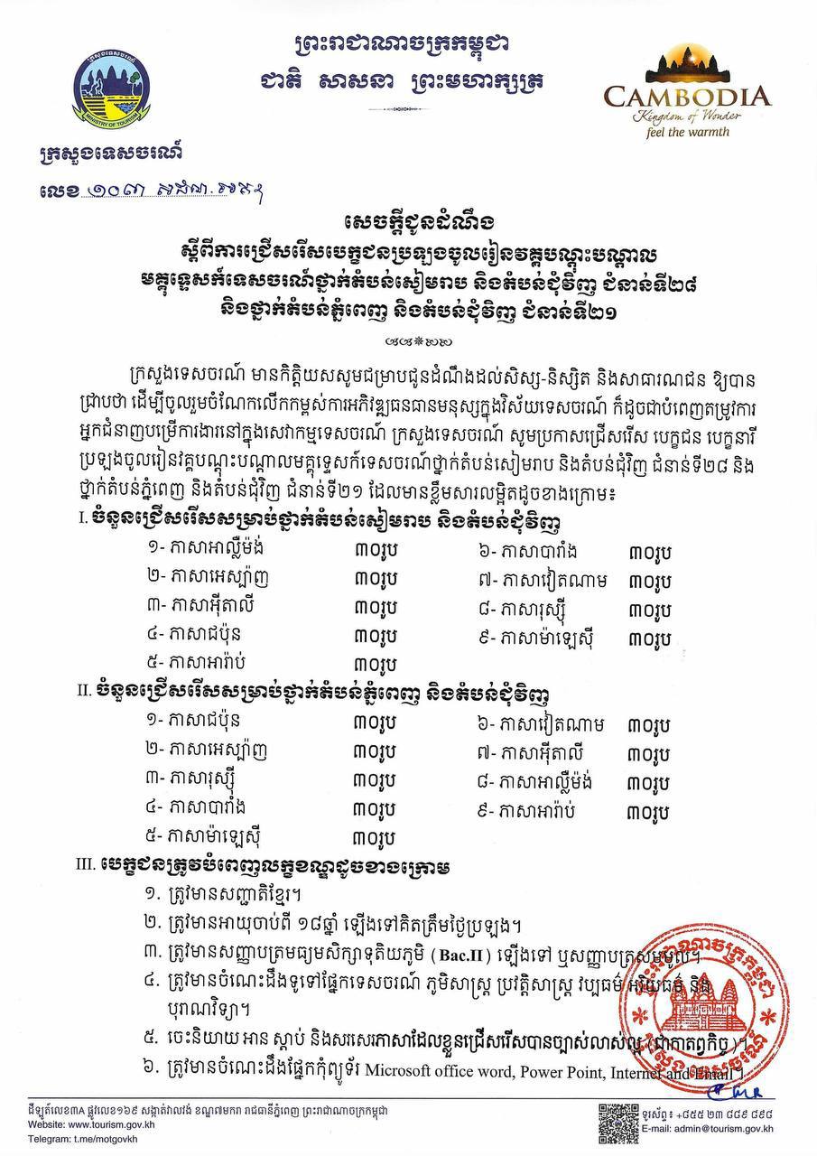 ក្រសួងទេសចរណ៍ សូមលើកទឹកចិត្តដល់ បេក្ខជន បេក្ខនារី ដែលជាសិស្ស-និស្សិត អ្នកកំពុងបម្រើការងារក្នុងវិស័យទេសចរណ៍ និងសាធារណជន ចូលរួមដាក់ពាក្យប្រឡងចូលរៀនឱ្យបានកាន់តែច្រើន។