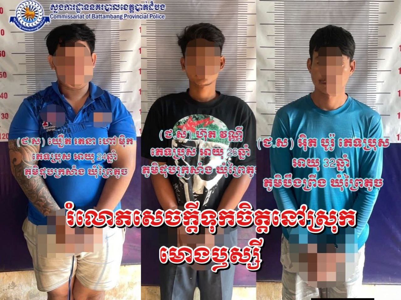 ខេត្តបាត់ដំបង : កាលពីថ្ងៃទី១៤ខែមីនា ឆ្នាំ២០២៦ វេលាម៉ោង៧និង២០នាទីនៅចំណុចក្រុមទី៧ ភូមិកូនខ្លុង ឃុំព្រៃតូច ស្រុកមោងឫស្សី ខេត្តបាត់ដំបង ស្របតាមអនុសាសន៍ដ៏ខ្ពង់ខ្ពស់របស់លោក នាយឧត្តមសេនីយ៍ ស ថេត អគ្គស្នងការនគរបាលជាតិនិងការចង្អុលទិសដឹកនាំរបស់លោកឧត្តមសេនីយ៍ទោ ដាញ់អេងប៊ុនចាន់ ស្នងការនៃស្នងការដ្ឋាននគរបាលខេត្តបាត់ដំបង លោកវរសេនីយ៍ឯក ស គឹមឡុង អធិការនគរបាលស្រុក មោងឫស្សី បានដឹកនាំធ្វេីការឃ-ាត់ខ្លួនជនសង្ស័យចំនួន ០៣នាក់ពាក់ព័ន្ធករណីរំ-លោ-ភលើសេចក្តីទុកចិត្តប្រព្រឹត្តិកាលពីថ្ងៃទី២៧ខែ កុម្ភៈឆ្នាំ២០២៦ នៅភូមិបឹងព្រីង ឃុំព្រៃតូច ស្រុកមោងឫស្សី ខេត្តបាត់ដំបង ដែលមានជនរងគ្រោះឈ្មោះ វ៉ាន់ ចិត្រា ភេទប្រុស អាយុ៤៣ឆ្នាំ (រស់នៅភូមិ ឃុំ ជាមួយគ្នា)បាត់បង់ម៉ូតូនិងទូរស័ព្ទហេីយគេចខ្លួន។