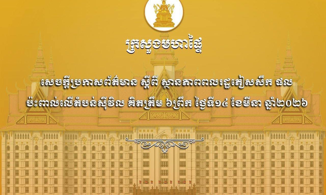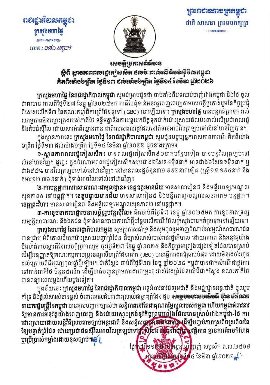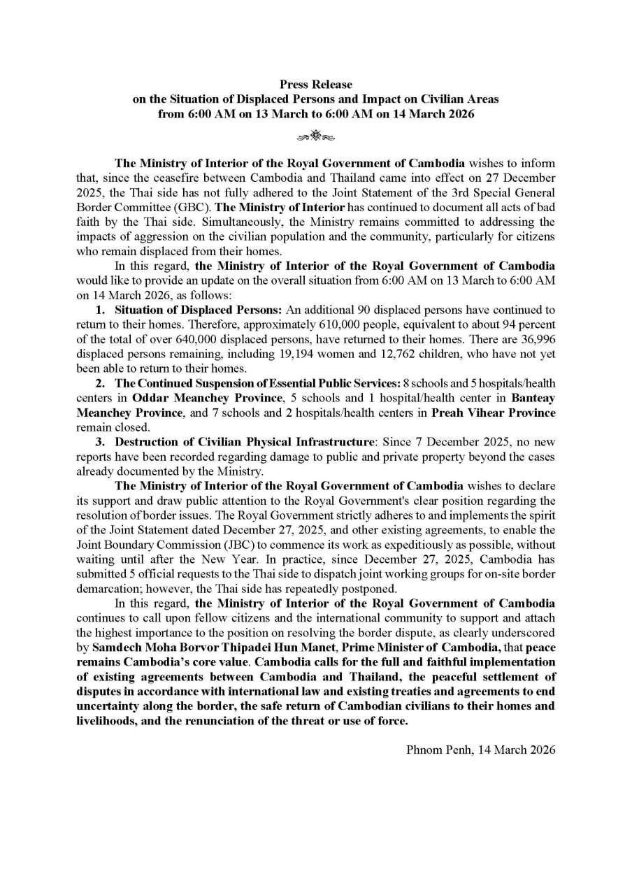 ភ្នំពេញ៖ ក្រសួងមហាផ្ទៃ នៃរាជរដ្ឋាភិបាលកម្ពុជា សូមជម្រាបជូនថា ចាប់តាំងពីបទឈប់បាញ់រវាងកម្ពុជា និងថៃ ចូល ជាធរមាន កាលពីថ្ងៃទី២៧ ខែធ្នូ ឆ្នាំ២០២៥មក ភាគីថៃពុំទាន់អនុវត្តពេញលេញតាមសេចក្តីប្រកាសរួមនៃកិច្ចប្រជុំ ពិសេសលើកទី៣ នៃគណៈកម្មាធិការព្រំដែនទូទៅ (GBC) នៅឡើយទេ។ ក្រសួងមហាផ្ទៃ បានបន្តកត់ត្រាទុក សកម្មភាពមិនស្មោះត្រង់របស់ភាគីថៃ ទន្ទឹមគ្នានឹងការបន្តយកចិត្តទុកដាក់ដោះស្រាយផលប៉ះពាល់លើប្រជាពលរដ្ឋ និងតំបន់ស៊ីវិល ដោយសារអំពើឈ្លានពាន ជាពិសេសពលរដ្ឋដែលនៅពុំទាន់អាចវិលត្រឡប់ទៅលំនៅឋានវិញបាន។ ក្នុងស្ថានភាពនេះ ក្រសួងមហាផ្ទៃ នៃរាជរដ្ឋាភិបាលកម្ពុជា សូមជូនបច្ចុប្បន្នភាពសភាពការណ៍ គិតពីម៉ោង ៦ព្រឹក ថ្ងៃទី១៣ ដល់ម៉ោង៦ព្រឹក ថ្ងៃទី១៤ ខែមីនា ឆ្នាំ២០២៦ ដូចខាងក្រោម៖ ១-ស្ថានភាពពលរដ្ឋភៀសសឹក៖ មានពលរដ្ឋភៀសសឹក៩០នាក់បន្ថែមទៀត បានបន្តវិលត្រឡប់ទៅ លំនៅឋានវិញ។ ដូច្នេះ ក្នុងចំណោមពលរដ្ឋភៀសសឹកសរុបជាង៦សែន៤ម៉ឺននាក់ មានជាង៦សែន១ម៉ឺននាក់ ឬ ជាង៩៤% បានវិលត្រឡប់ទៅលំនៅឋានវិញ។ នៅមានពលរដ្ឋចំនួន៣៦.៩៩៦នាក់ទៀត (ស្រ្តី១៩.១៩៤នាក់ និង កុមារ១២.៧៦២នាក់) ពុំទាន់អាចវិលទៅលំនៅឋានវិញ។