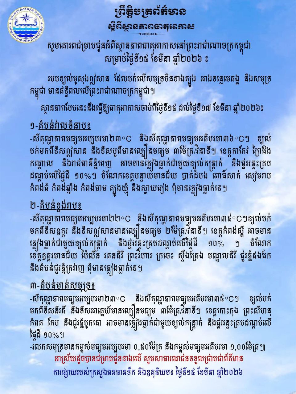 ព្រឹត្តិបត្រព័ត៌មាន ស្តីពីស្ថានភាពធាតុអាកាស នៃ ការផ្សាយរបស់ក្រសួងធនធានទឹក និងឧតុនិយម នៅ ថ្ងៃទី១៥ ខែមីនា ឆ្នាំ២០២៦