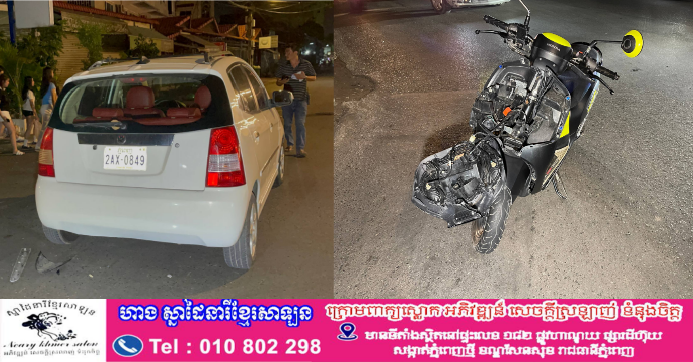 តាមប្រភពព័ត៌មានពីកន្លែងកើតហេតុបានឲ្យដឹងថា នៅមុនពេលកើតហេតុគេឃើញរថយន្តម៉ាកMOR NINGពណ៌សមួយគ្រឿងពាក់ផ្លាកលេខ ភ្នំពេញ 2AX-0849បើកបរដោយនារីម្នាក់ធ្វើដំណើរចេញពីផ្លូវ២៨៧ ទិសដៅពីជើងទៅត្បូងឆ្លងផ្លូវបំបែកជាបួន ខណះពេលបើកឆ្លងដល់ពាក់កណ្តាលផ្លូវស្រាប់តែគេឃើញបុរសរងគ្រោះម្នាក់ជិះម៉ូតូម៉ាកហុងដា scoopy ពណ៌ខ្មៅមួយគ្រឿងពាក់ផ្លាកលេខភ្នំពេញ 1KE-9387 ធ្វើដំណើរតាមបណ្តោយផ្លូវ៥៦៦ទិសដៅពីកើតទៅលិចឆ្លងផ្លូវដូចគ្នាក្នុងល្បឿនលឿនមិនប្រយ័ត្នក៏ជ្រុលទៅបុកចំពាក់កណ្តាលរថយន្តចំហៀងខាងឆ្វេងយ៉ាងពេញទំហឹងបណ្តាលឲ្យរងការខូចខាតសម្ភារះទាំងសងខាងយ៉ាងដំណំ និងបណ្តាលឲ្យបុរសម្នាក់ភាគីខាងម៉ូតូរងរបួសស្រាល។