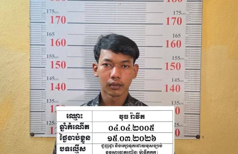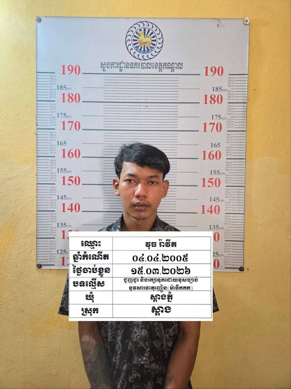 ខេត្តកណ្តាល ÷ សមត្ថកិច្ចបានឃាត់ខ្លួននិងវាយខ្នោះភ្លាមៗ ទៅលើជនសង្ស័យម្នាក់ដែលគ្រាន់តែសមត្ថកិច្ចក្រឡេកភ្នែកចំ មានអាកប្បកិរិយា ភិតភ័យតក់ស្លុត ពេលហៅសួរនាំឆែកឆេ ក៏រកឃើញគ្រឿងញៀនប្រភេទ មេតាំហ្វេតាមីន (ម៉ាទឹកកក)ចំនួន៥កញ្ចប់មធ្យមទម្ងន់ សរុប ៧២,៣២ក្រាម។ ហេតុការណ៍បានកើតឡើងកាលពីវេលាម៉ោង ១១និង១០នាទី ថ្ងៃទី១៥ខែមីនាឆ្នាំ២០២៦ នៅចំណុចក្នុងភូមិដំរីឆ្លង ឃុំស្អាងភ្នំ ស្រុកស្អាង ខេត្តកណ្តាល ។
