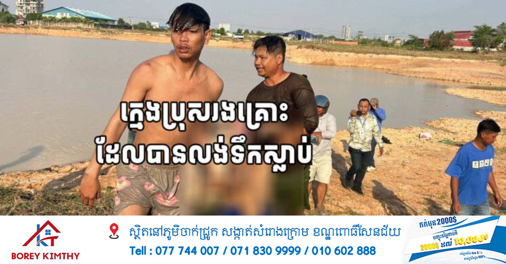 ភ្នំពេញ ៖ ក្មេងប្រុសអាយុ១២ឆ្នាំម្នាក់ បានលង់ទឹកលិច បាត់អស់រយៈពេលប្រមាណ៣ម៉ោង ទើបអ្នកភូមិ អូសអួនរកសពឃើញ ខណៈពេលចុះទៅជួយសង្គ្រោះប្អូនភ្លោះ២នាក់ ដែលលង់ទឹក ។
