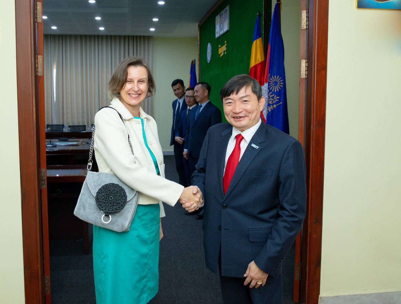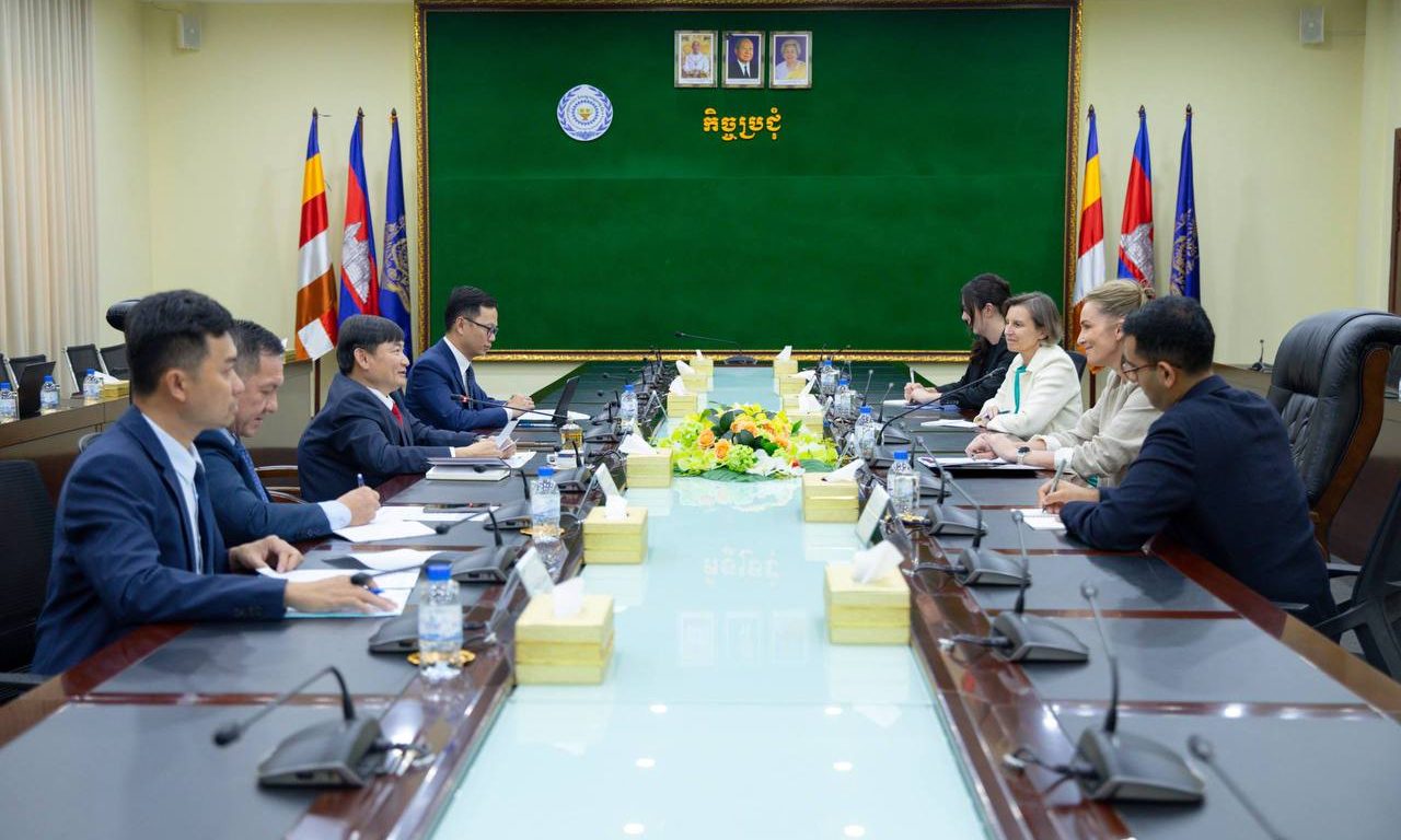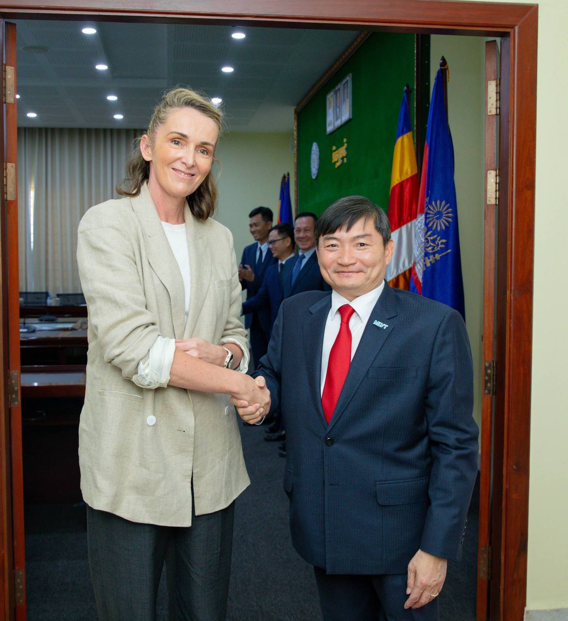 (ភ្នំពេញ)៖ នៅរសៀលថ្ងៃអង្គារ ទី១៧ ខែមីនា ឆ្នាំ២០២៦ នាទីស្តីការក្រសួង ឯកឧត្តម ហេង សួរ រដ្ឋមន្ត្រីក្រសួងការងារ និងបណ្ដុះបណ្ដាលវិជ្ជាជីវៈ បានទទួលជួបសម្ដែងការគួរសម និងពិភាក្សាការងារជាមួយលោកស្រី ប្រីជែត ខូលៀរ (Bridget Collier) ភារធារីស្ថានទូតអូស្ត្រាលីប្រចាំកម្ពុជា និងលោកស្រី ធេនណាល អូហ្សេនណេស៊ី (Tennealle O’Shannessy) នាយិការប្រតិបត្តិនៃ IDP Education និងជាអ្នកធុរកិច្ចឆ្នើមអូស្ត្រាលីប្រចាំនៅកម្ពុជា ដើម្បីផ្លាស់ប្តូរមតិយោបល់ពីការពង្រឹងកិច្ចសហប្រតិបត្តិការរវាងកម្ពុជា និងអូស្ត្រាលីក្នុងការអភិវឌ្ឍជំនាញវិជ្ជាជីវៈ (TVET) ការបណ្តុះបណ្តាលភាសាអង់គ្លេស និងការជំរុញទំនាក់ទំនងធុរកិច្ចរវាងប្រទេសទាំងពីរ។