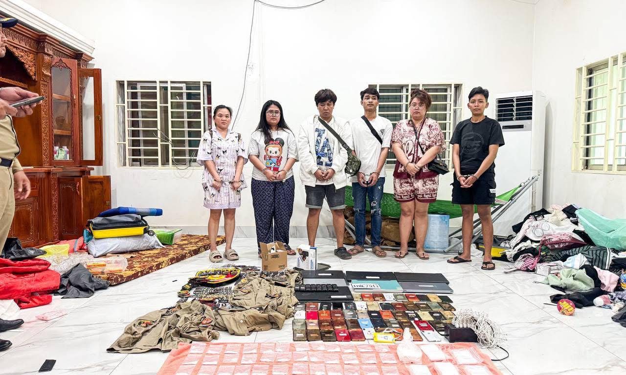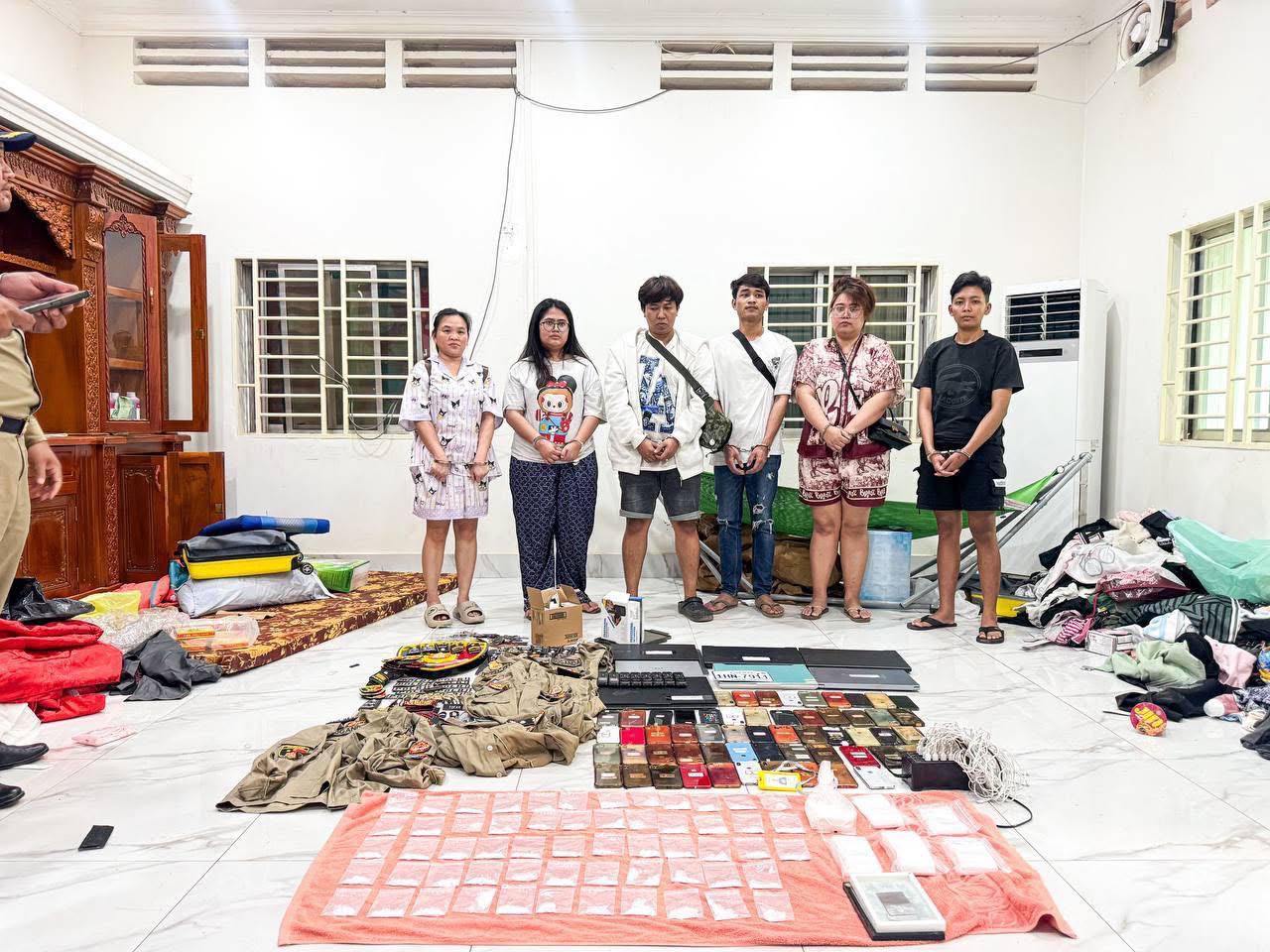 ជាក់ស្ដែងនៅទីតាំងផ្ទះជួលខាងលេីឈ្មោះ សុខ នី រស់នៅភ្នំពេញ ជាអ្នកជួលអោយជនបរទេសទាំងនេះស្នាក់នៅ សមត្ថកិច្ចជំនាញបានរកឃេីញជនបរទេសចំនួន ៦ នាក់ ស្រី ៤ មានសញ្ជាតិឥណ្ឌូណេសុី ដែលទេីបមកជួលផ្ទះខាងលេីដេីម្បីស្នាក់នៅបណ្ដោះអាសន្ន និងបានធ្វេីការត្រួតពិនិត្យរកឃេីញសម្ភារៈឧបករណ៍សង្ស័យពាក់ព័ន្ធការប្រព្រឹត្ដបទល្មេីសឆបោកតាមប្រព័ន្ធបច្ចេកវិទ្យា( Online Scams ) រួមមាន៖ ទូរសព្ទដៃ ៥៩គ្រឿង, កុំព្យូទ័រយួរដៃ Laptop ៧គ្រឿង និងឧបករណ៍ថតសំឡេង ៨គ្រឿង , ឯកសណ្ឋានសមត្ថកិច្ចបរទេសមិនមែនកម្ពុជា អាវ៤ សញ្ញាស័ក្តិ និងលោហ្គោមួយចំនួន, ម្សៅក្រាមសថ្លា សង្ស័យជាគ្រឿងញៀន ចំនួន ៥៩កញ្ចប់តូច និង ១កញ្ចប់ធំ។