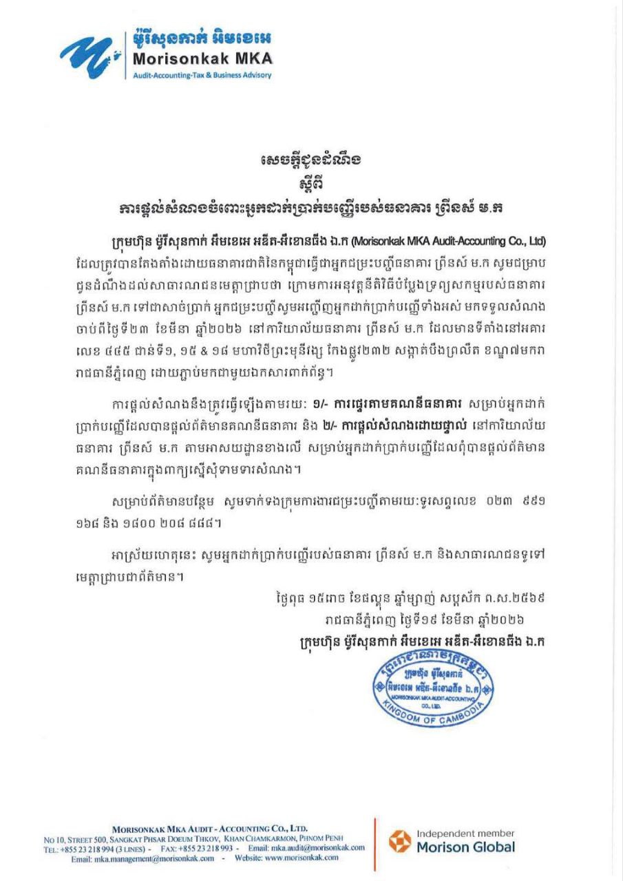 ភ្នំពេញ : ក្រុមហ៊ុន ម៉ូរីសុនកាក់ អឹមខេអេ អឌីត-អីខោនចឹង ឯ.ក (Morisonkak MKA Audit-Accounting Co., Ltd) ដែលត្រូវបានតែងតាំងដោយធនាគារជាតិនៃកម្ពុជាធ្វើជាអ្នកជម្រះបញ្ជីធនាគារ ព្រីនស៍ ម.ក សូមជម្រាប ជូនដំណឹងដល់សាធារណជនមេត្តាជ្រាបថា ក្រោមការអនុវត្តនីតិវិធីបំប្លែងទ្រព្យសកម្មរបស់ធនាគារ ព្រីនស៍ ម.ក ទៅជាសាច់ប្រាក់ អ្នកជម្រះបញ្ជីសូមអញ្ជើញអ្នកដាក់ប្រាក់បញ្ញើទាំងអស់ មកទទួលសំណង ចាប់ពីថ្ងៃទី២៣ ខែមីនា ឆ្នាំ២០២៦ នៅការិយាល័យធនាគារ ព្រីនស៍ ម.ក ដែលមានទីតាំងនៅអគារ លេខ ៤៤៥ ជាន់ទី១, ១៥ & ១៨ មហាវិថីព្រះមុនីវង្ស កែងផ្លូវ២៣២ សង្កាត់បឹងព្រលឹត ខណ្ឌ៧មករា រាជធានីភ្នំពេញ ដោយភ្ជាប់មកជាមួយឯកសារពាក់ព័ន្ធ។