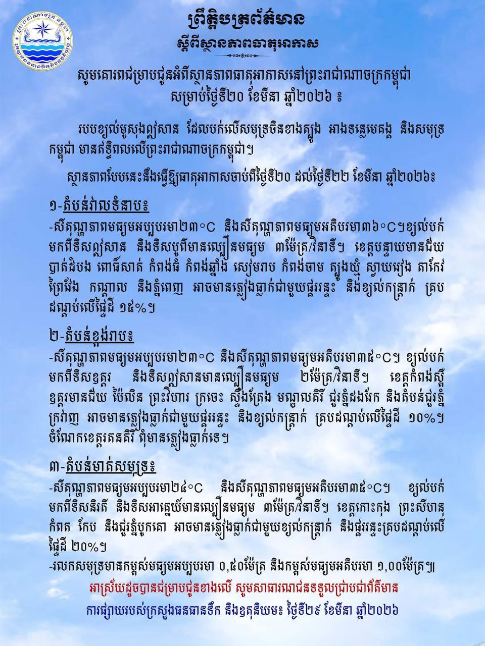 ភ្នំពេញ៖ ក្រសួងធនធានទឹក និងឧតុនិយម នៅព្រឹកថ្ងៃទី២០ ខែមីនា ឆ្នាំ២០២៦នេះ បានចេញសេចក្ដីជូនដំណឹងស្តីពីស្ថានភាពធាតុអាកាសនៅព្រះរាជាណាចក្រកម្ពុជា ខណៈរបបខ្យល់មូសុងឦសាន ដែលបក់លើសមុទ្រចិនខាងត្បូង អាងទន្លេមេគង្គ និងសមុទ្រ កម្ពុជា មានឥទ្ធិពលលើព្រះរាជាណាចក្រកម្ពុជា។
