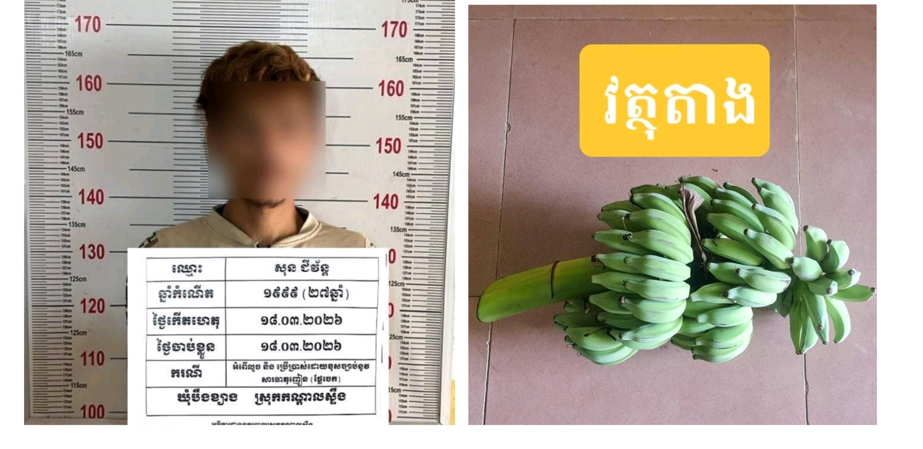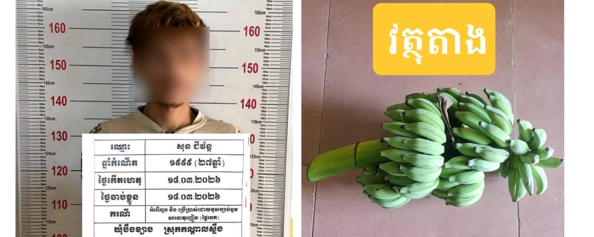 ខេត្តកណ្ដាល÷ បុរសជាមុខសញ្ញាញៀនថ្នាំម្នាក់ដែលទើបនឹងចេញពីពន្ធនាគារ ត្រូវបានកម្លាំងនគរបាលស្រុកកណ្តាលស្ទឹងឃាត់ខ្លួនភ្លាមៗ ខណៈកំពុងលីផ្លែចេកខ្ចី ១ស្ទោង ដែលខ្លួនទើបនឹងលួចកាត់យកទៅលក់ កាលពី យប់ ថ្ងៃទី១៨ មីនា ២០២៦ នៅចំណុចភូមិព្រៃតាតូច ឃុំបឹងខ្យាង ស្រុកកណ្តាលស្ទឹង ខេត្តកណ្តាល។