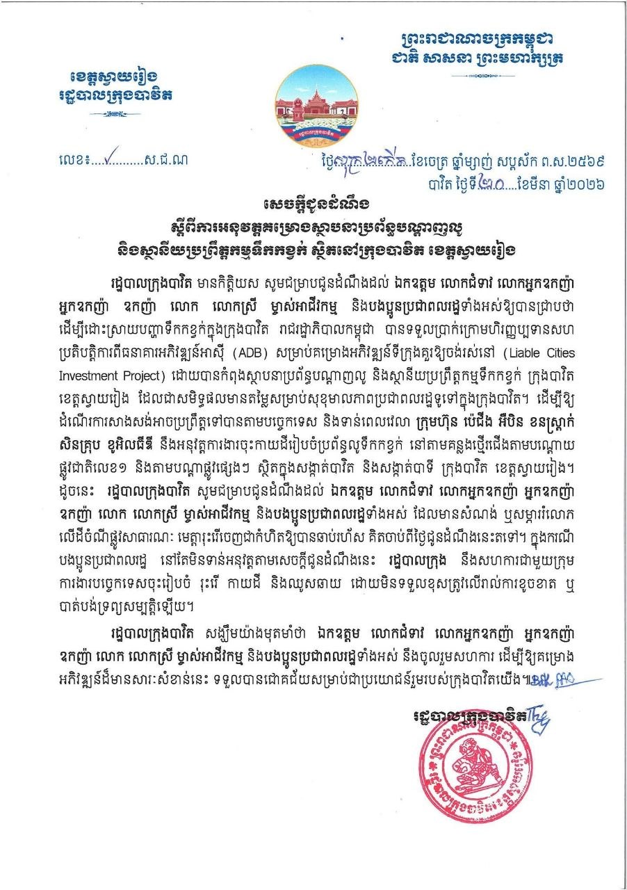 ខេត្តស្វាយរៀង: រដ្ឋបាលក្រុងបាវិត មានកិត្តិយស សូមជម្រាបជូនដំណឹងដល់ ឯកឧត្តម លោកជំទាវ លោកអ្នកឧកញ៉ា អ្នកឧកញ៉ា ឧកញ៉ា លោក លោកស្រី ម្ចាស់អាជីវកម្ម និងបងប្អូនប្រជាពលរដ្ឋទាំងអស់ឱ្យបានជ្រាបថា ដើម្បីដោះស្រាយបញ្ហាទឹកកខ្វក់ក្នុងក្រុងបាវិត រាជរដ្ឋាភិបាលកម្ពុជា បានទទួលប្រាក់ក្រោមហិរញ្ញប្បទានសហ ប្រតិបត្តិការពីធនាគារអភិវឌ្ឍន៍អាស៊ី (ADB) សម្រាប់គម្រោងអភិវឌ្ឍន៍ទីក្រុងគួរឱ្យចង់រស់នៅ (Liable Cities Investment Project) ដោយបានកំពុងស្ថាបនាប្រព័ន្ធបណ្តាញលូ និងស្ថានីយប្រព្រឹត្តកម្មទឹកកខ្វក់ ក្រុងបាវិត ខេត្តស្វាយរៀង ដែលជាសមិទ្ធផលមានតម្លៃសម្រាប់សុខុមាលភាពប្រជាពលរដ្ឋទូទៅក្នុងក្រុងបាវិត។ ដើម្បីឱ្យ ដំណើរការសាងសង់អាចប្រព្រឹត្តទៅបានតាមបច្ចេកទេស និងទាន់ពេលវេលា ក្រុមហ៊ុន ប៉េជើង អឺបិន ខនស្ត្រាក់ សិនគ្រុប ខូអិលធីឌី នឹងអនុវត្តការងារចុះកាយដីរៀបចំប្រព័ន្ធលូទឹកកខ្វក់ នៅតាមគន្លងថ្មើរជើងតាមបណ្តោយ ផ្លូវជាតិលេខ១ និងតាមបណ្តាផ្លូវផ្សេងៗ ស្ថិតក្នុងសង្កាត់បាវិត និងសង្កាត់បាទី ក្រុងបាវិត ខេត្តស្វាយរៀង។ ដូចនេះ រដ្ឋបាលក្រុងបាវិត សូមជម្រាបជូនដំណឹងដល់ ឯកឧត្តម លោកជំទាវ លោកអ្នកឧកញ៉ា អ្នកឧកញ៉ា ឧកញ៉ា លោក លោកស្រី ម្ចាស់អាជីវកម្ម និងបងប្អូនប្រជាពលរដ្ឋទាំងអស់ ដែលមានសំណង់ ឬសម្ភាររំលោភ លើដីចំណីផ្លូវសាធារណៈ មេត្តារុះរើចេញជាកំហិតឱ្យបានឆាប់រហ័ស គិតចាប់ពីថ្ងៃជូនដំណឹងនេះតទៅ។ ក្នុងករណី បងប្អូនប្រជាពលរដ្ឋ នៅតែមិនទាន់អនុវត្តតាមសេចក្តីជូនដំណឹងនេះ រដ្ឋបាលក្រុង នឹងសហការជាមួយក្រុម ការងារបច្ចេកទេសចុះរៀបចំ រុះរើ កាយដី និងឈូសឆាយ ដោយមិនទទួលខុសត្រូវលើរាល់ការខូចខាត ឬ បាត់បង់ទ្រព្យសម្បត្តិឡើយ។