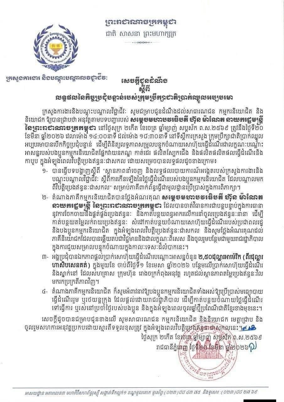 ភ្នំពេញ : យោងតាមសេចក្តីជូនដំណឹងស្តីពីលទ្ធផលនៃកិច្ចប្រជុំបន្ទាន់របស់ក្រុមប្រឹក្សាជាតិប្រាក់ឈ្នួលអប្បបរមាបានឲ្យដឹងថា អនុវត្តតាមបទបញ្ជារបស់សម្តេចធិបតី ហ៊ុន ម៉ាណែត នាយករដ្ឋមន្ត្រី នៃព្រះរាជាណាចក្រកម្ពុជា នៅថ្ងៃទី២០ ខែមីនា ឆ្នាំ២០២៦ វេលាម៉ោង ១៤:០០នាទី ដល់ម៉ោង ១៨:៣០នាទី នៅទីស្តីការក្រសួងការងារនិងបណ្ដុះបណ្ដាលវិជ្ជាជីវៈ ក្រុមប្រឹក្សាជាតិប្រាក់ឈ្នួល អប្បបរមា បានបើកកិច្ចប្រជុំបន្ទាន់ដើម្បីពិនិត្យលទ្ធភាពសម្រួលបន្ទុកចំណាយសោហ៊ុយធ្វើដំណើរជាលក្ខណៈបណ្តោះអាសន្នរបស់បងប្អូនកម្មករនិយោជិតផ្នែកវាយនភណ្ឌ កាត់ដេរ ផលិតស្បែកជើងនិងផលិតផលិតផលធ្វើដំណើរនិងកាបូបក្នុងអំឡុងពេលវិបត្តិប្រេងឥន្ធនៈជាសកល។