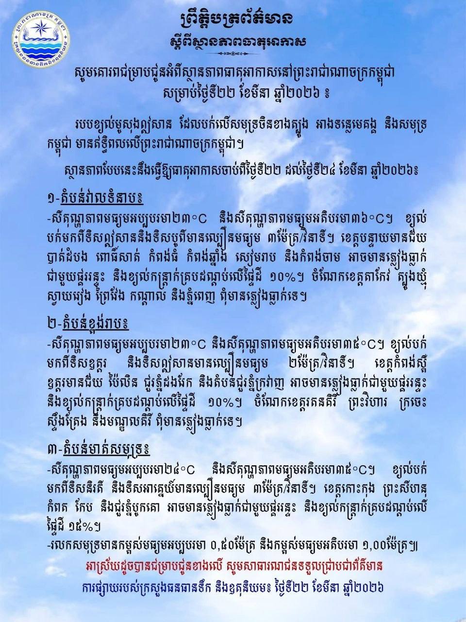 ភ្នំពេញ៖ ក្រសួងធនធានទឹក និងឧតុនិយម នៅព្រឹកថ្ងៃទី២២ ខែមីនា ឆ្នាំ២០២៦នេះ បានចេញសេចក្ដីជូនដំណឹងស្តីពីស្ថានភាពធាតុអាកាសនៅព្រះរាជាណាចក្រកម្ពុជា ខណៈរបបខ្យល់មូសុងឦសាន ដែលបក់លើសមុទ្រចិនខាងត្បូង អាងទន្លេមេគង្គ និងសមុទ្រ កម្ពុជា មានឥទ្ធិពលលើព្រះរាជាណាចក្រកម្ពុជា។