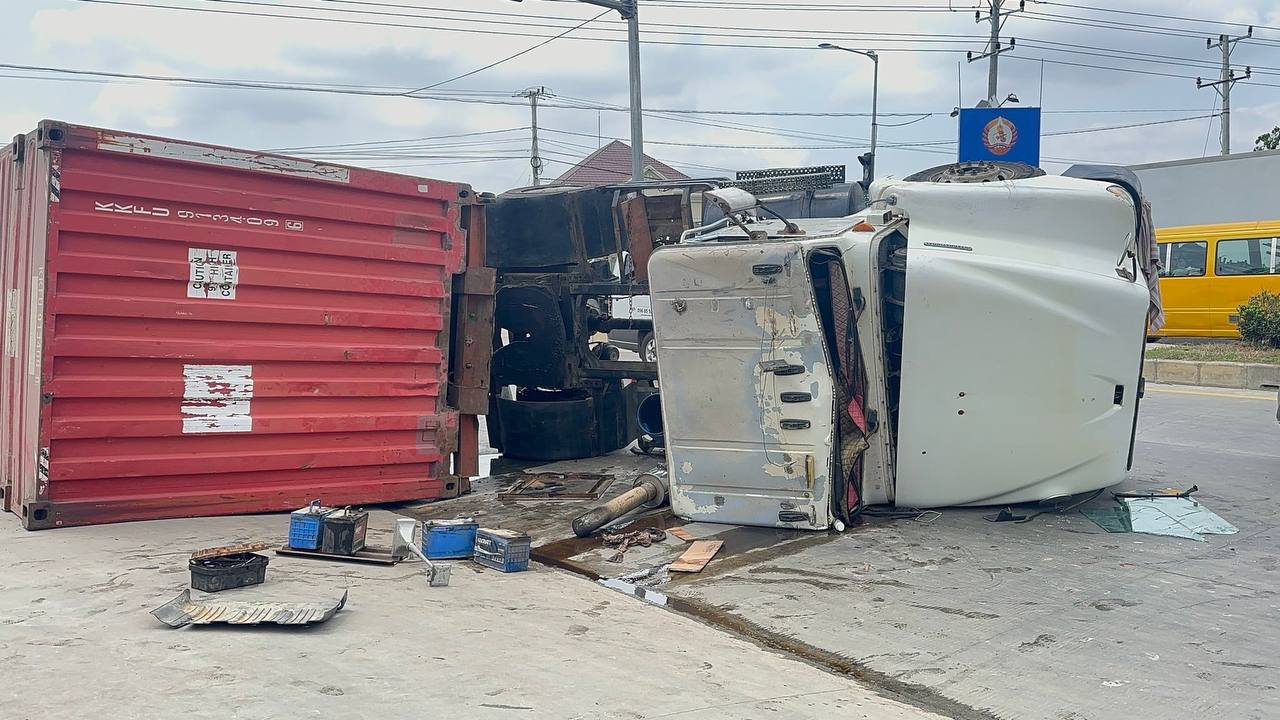 ភ្នំពេញ៖ បុរសម្នាក់បេីករថយន្តកុងតឺន័របត់ឆ្វេងឆ្លងផ្លីវលេីសល្បឿនកំណត់បានក្រឡាប់ផ្ងារជេីងរងការខូចខាតសំណាងមិនមានមនុស្សរងរបួស។