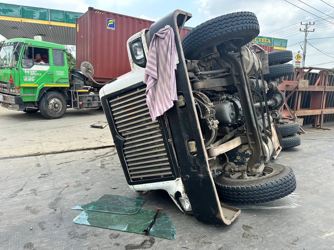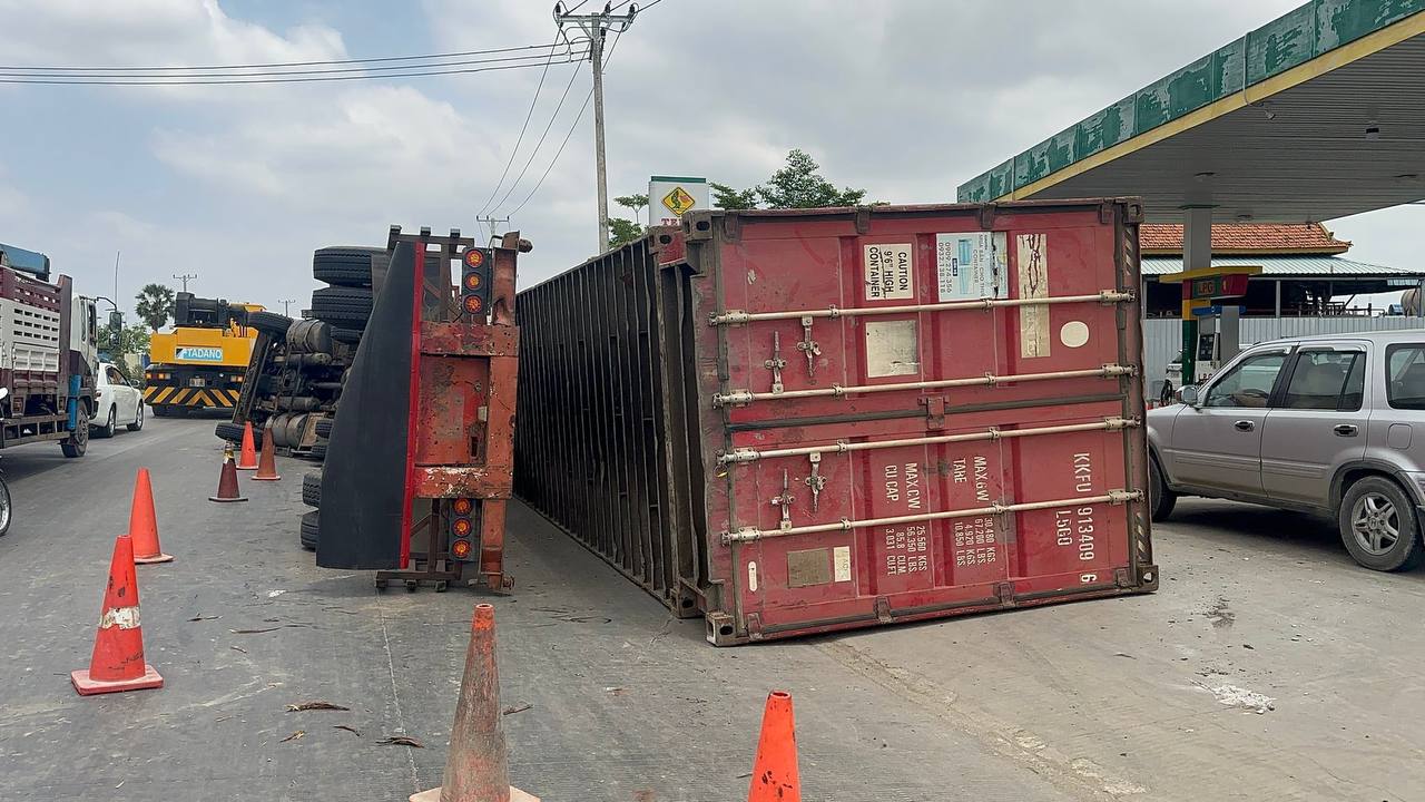 តាមប្រភពព័ត៌មានបានឱ្យដឹងថា មុនពេលកេីតហេតុគេបានឃេីញបុរសម្នាក់បេីករថយន្តកុងតឺន័រ ធ្វេីដំណេីរតាមបណ្តោយផ្លូវបេតុងក្នុងទិសដៅពីលិចទៅកេីតហេីយបានឡេីងផ្លូវក្រវ៉ាត់ក្រុងទី៣បួងចង្កូតបត់ឆ្វេងលឿនធ្វេីឱ្យរថយន្តក្រឡាប់ផ្ងាជេីងសំណាងមិនប៉ះពាល់ដល់អ្នកផ្សេង។
