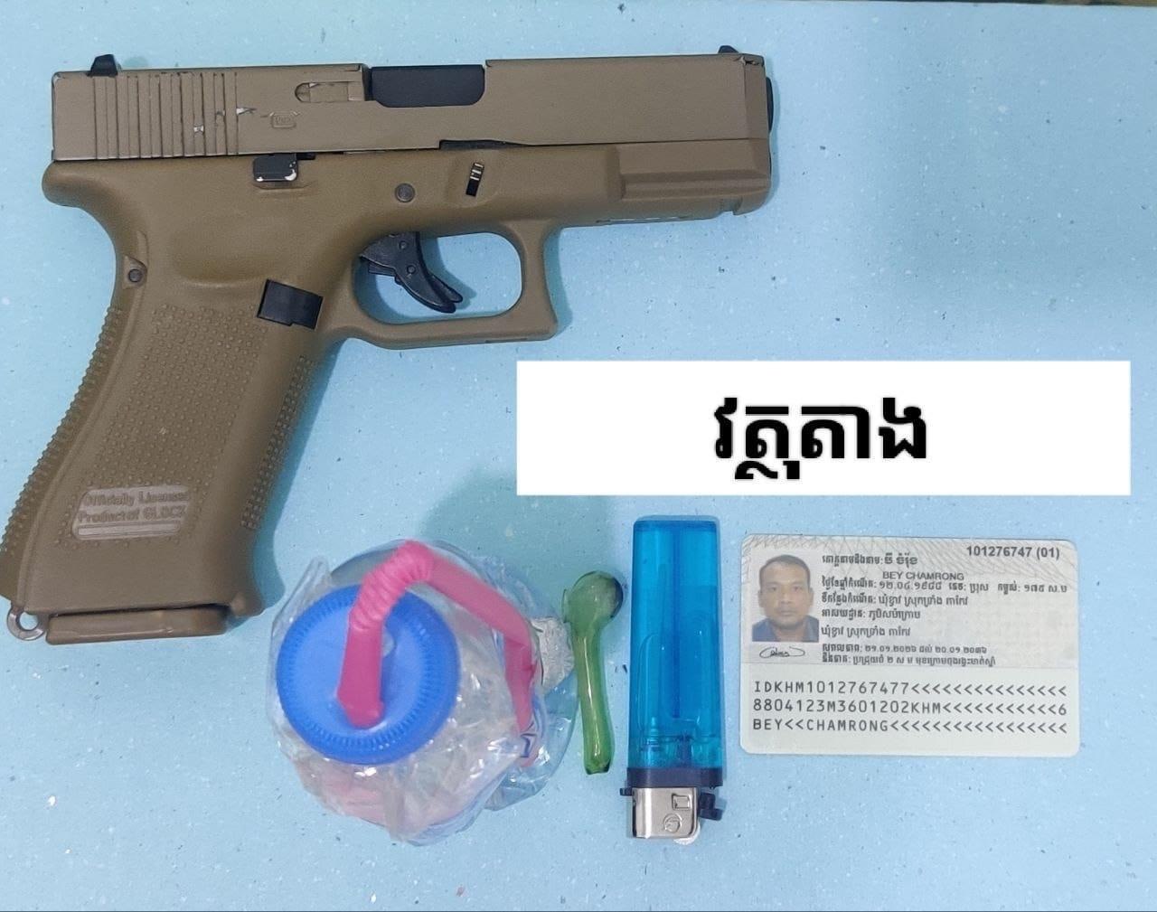 វត្ថុតាងចាប់យក៖១-កាំភ្លើងខ្លីម៉ាក LOCK 19X AUSTRIA(កាំភ្លើងខ្យល់)។២-អត្តសញ្ញាណប័ណ្ណសញ្ជាតិខ្មែរ០១សន្លឹក។៣-ឧបករណ៍សម្រាប់ប្រើប្រាស់ថ្នាំញៀន ,៤-ដែកកេះ០១ពណ៌ខៀវ០១។