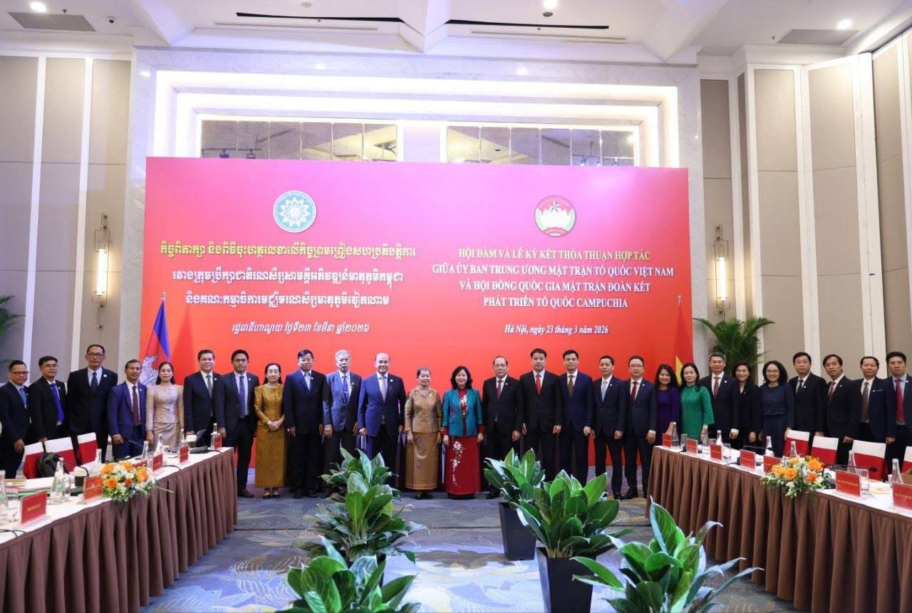 សម្តេចកិត្តិសង្គហបណ្ឌិត ម៉ែន សំអន ប្រធានក្រុមប្រឹក្សាជាតិរណសិរ្សសាមគ្គី អភិវឌ្ឍន៍មាតុភូមិកម្ពុជា បានបញ្ជាក់បែបនេះ ក្នុងជំនួបពិភាក្សាជាមួយ លោកស្រី បួយ ធីមិញហ៊យ (Bùi Thị Minh Hoài) ប្រធានគណៈកម្មាធិកា រមជ្ឈិមរណសិរ្សមាតុភូមិវៀតណាម រួចក៏ព្រមព្រៀងចុះហត្ថលេខាលើកិច្ច សហប្រតិបត្តិការរវាងរណសិរ្សសាមគ្គី អភិវឌ្ឍន៍មាតុភូមិកម្ពុជា និងគណៈកម្មាធិការមជ្ឈិមរណសិរ្សមាតុភូមិវៀតណាម នៅសណ្ឋាគារ Melia រដ្ឋធានីហាណូយ នៃសាធារណរដ្ឋសង្គមនិយមវៀតណាម នាព្រឹកថ្ងៃចន្ទ ៥កើត ខែចេត្រ ឆ្នាំម្សាញ់ សប្តស័ក ព.ស.២៥៦៩ ត្រូវនឹងថ្ងៃទី២៣ ខែមីនា ឆ្នាំ២០២៦។