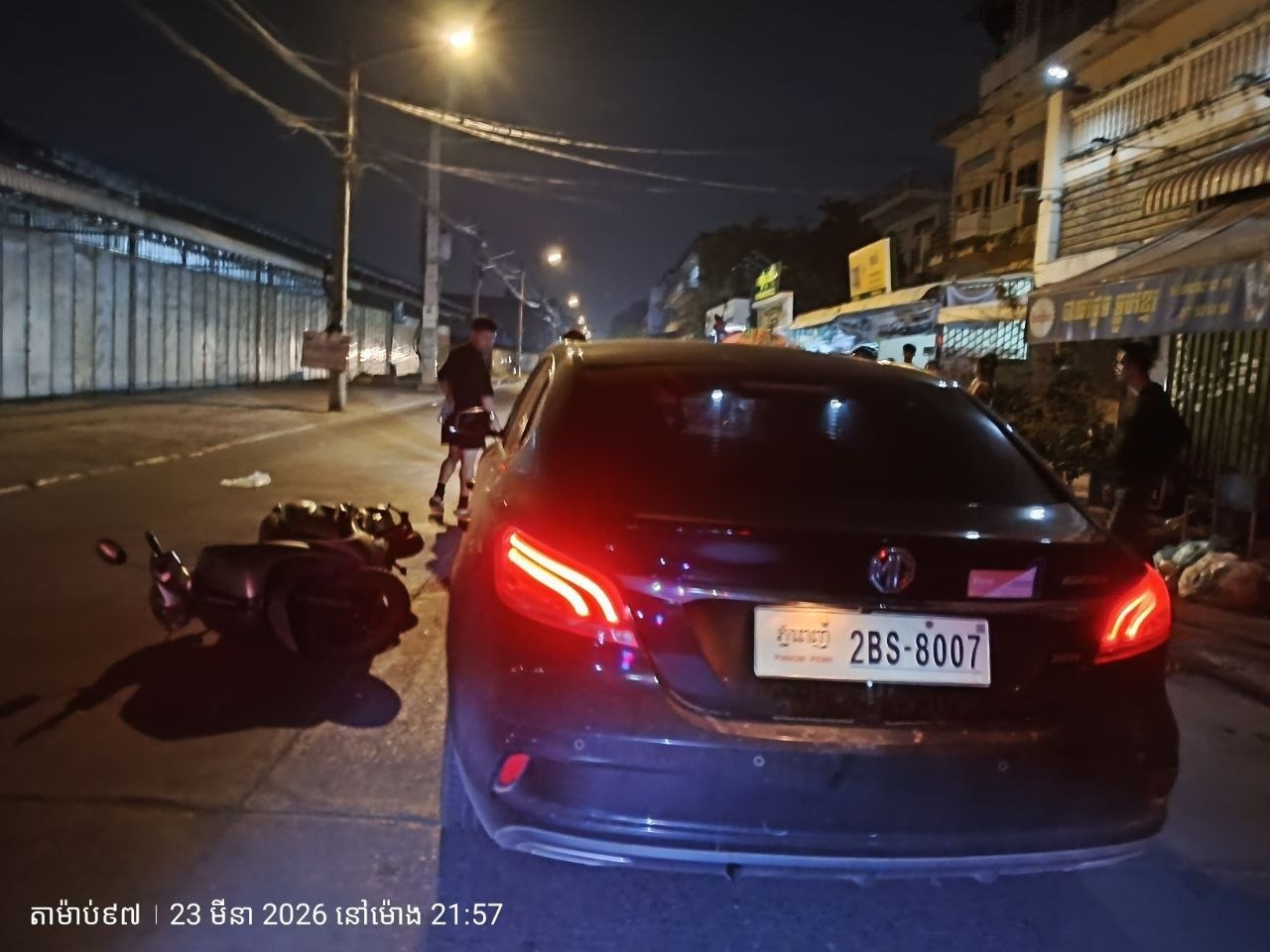 មុនពេលកើតហេតុគេឃើញមានបុរសម្នាក់បើករថយន្តម៉ាកMG ពាក់ស្លាកលេខភ្នំពេញ 2BS-8007 លុះមកដល់ចំណុចកើតហេតុអ្នកបើកបរក៏បត់ស្តាំឆ្លងផ្លូវហើយជ្រុលទៅបុកជាមួយម៉ូតូមួយគ្រឿងម៉ាកVespa មួយគ្រឿងពាក់ស្លាកលេខ