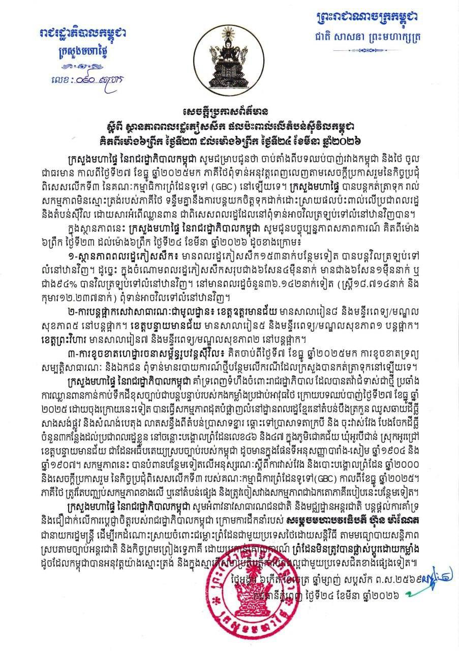 ភ្នំពេញ៖ ក្រសួងមហាផ្ទៃ នៃរាជរដ្ឋាភិបាលកម្ពុជា សូមជម្រាបជូនថា ចាប់តាំងពីបទឈប់បាញ់រវាងកម្ពុជា និងថៃ ចូល ជាធរមាន កាលពីថ្ងៃទី២៧ ខែធ្នូ ឆ្នាំ២០២៥មក ភាគីថៃពុំទាន់អនុវត្តពេញលេញតាមសេចក្តីប្រកាសរួមនៃកិច្ចប្រជុំ ពិសេសលើកទី៣ នៃគណៈកម្មាធិការព្រំដែនទូទៅ (GBC) នៅឡើយទេ។ ក្រសួងមហាផ្ទៃ បានបន្តកត់ត្រាទុក សកម្មភាពមិនស្មោះត្រង់របស់ភាគីថៃ ទន្ទឹមគ្នានឹងការបន្តយកចិត្តទុកដាក់ដោះស្រាយផលប៉ះពាល់លើប្រជាពលរដ្ឋ និងតំបន់ស៊ីវិល ដោយសារអំពើឈ្លានពាន ជាពិសេសពលរដ្ឋដែលនៅពុំទាន់អាចវិលត្រឡប់ទៅលំនៅឋានវិញបាន។