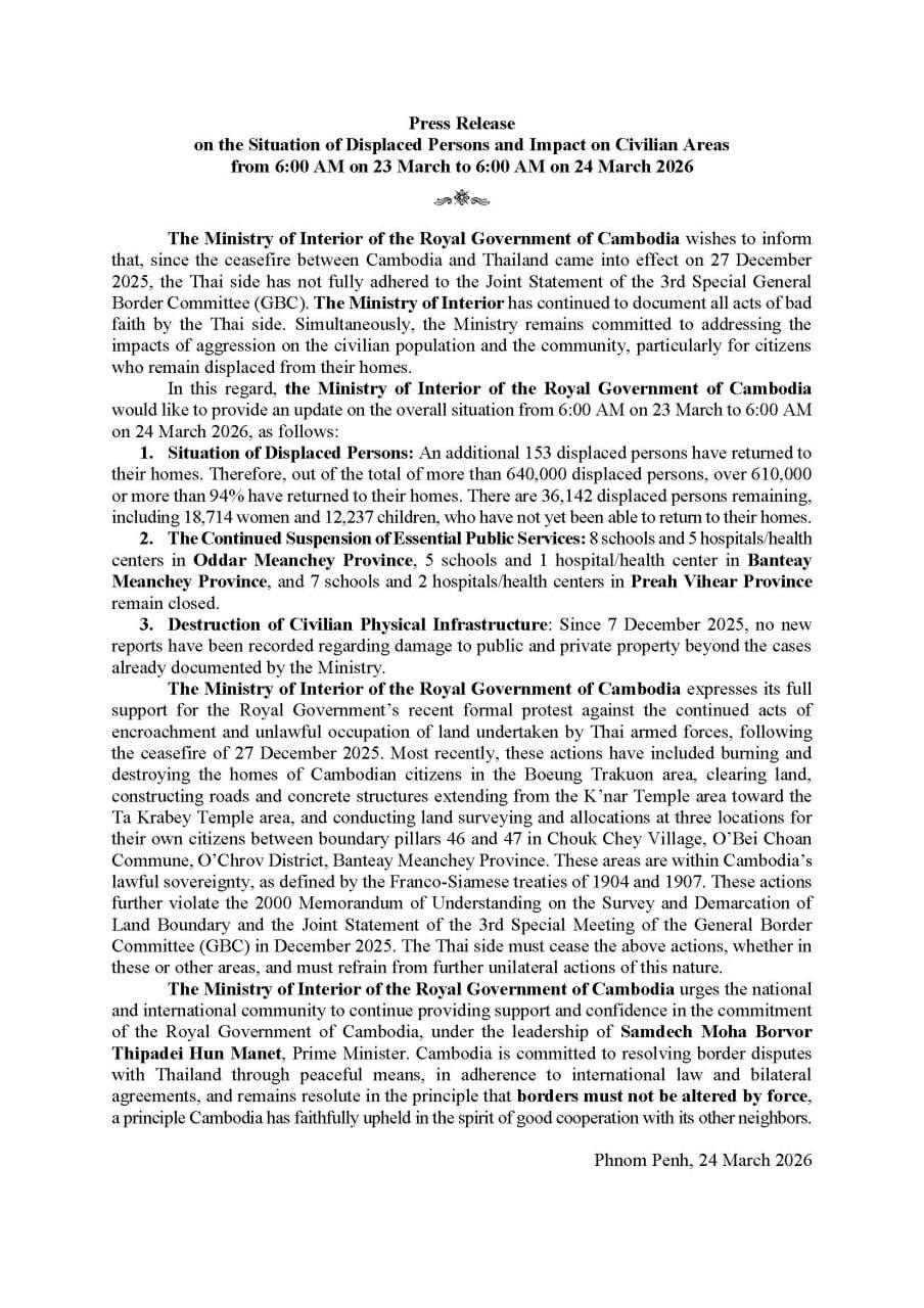 ក្នុងស្ថានភាពនេះ ក្រសួងមហាផ្ទៃ នៃរាជរដ្ឋាភិបាលកម្ពុជា សូមជូនបច្ចុប្បន្នភាពសភាពការណ៍ គិតពីម៉ោង ៦ព្រឹក ថ្ងៃទី២២ ដល់ម៉ោង៦ព្រឹក ថ្ងៃទី២៣ ខែមីនា ឆ្នាំ២០២៦ ដូចខាងក្រោម៖