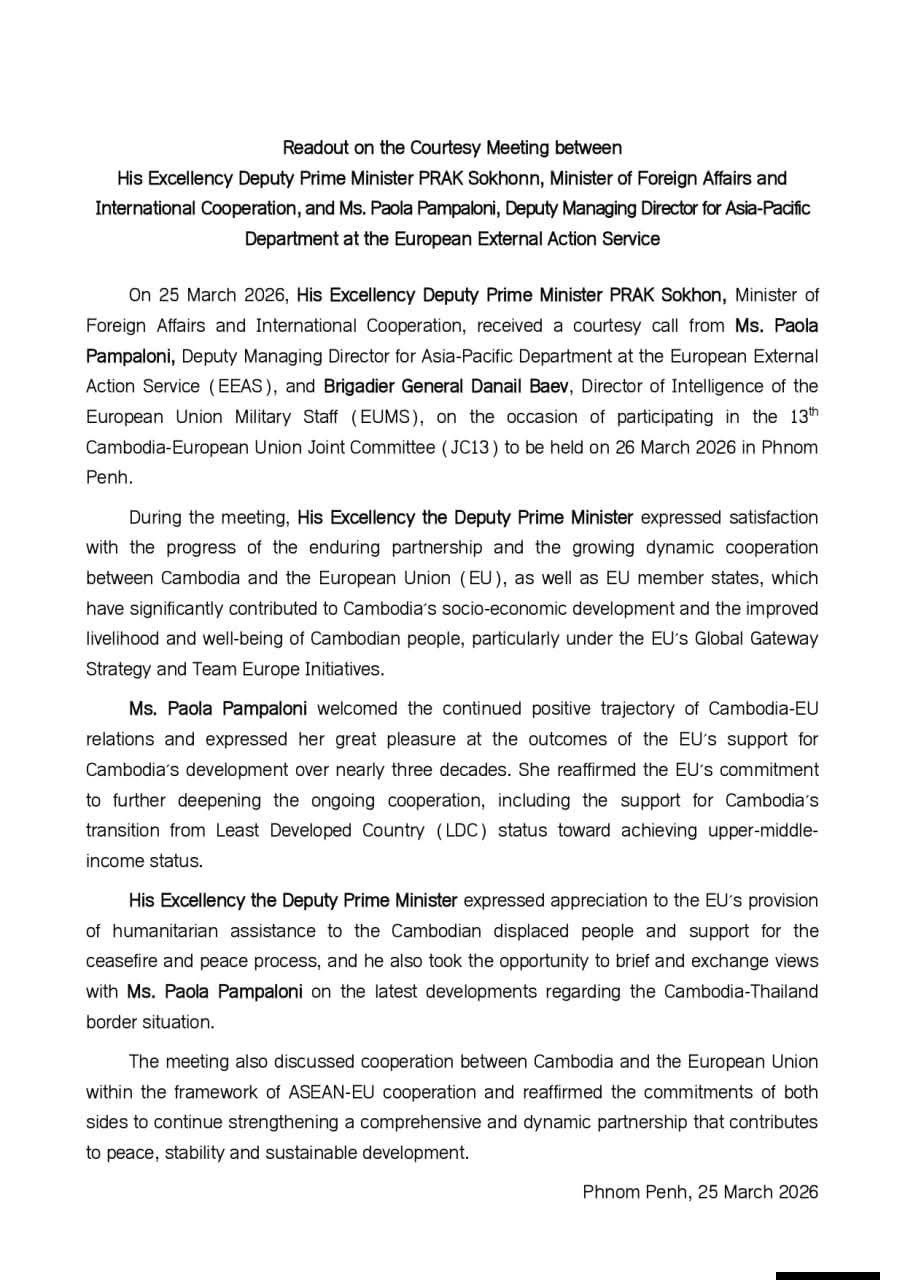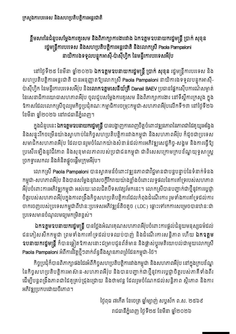 ភ្នំពេញ : លោកឧបនាយករដ្ឋមន្ត្រី ប្រាក់សុខុន រដ្ឋមន្រ្តីការបរទេស និងសហប្រតិបត្តិការអន្តរជាតិ បានថ្លែងអំណរគុណសហភាពអឺរ៉ុបចំពោះការផ្តល់ជំនួយមនុស្សធម៌ដល់ជនភៀសសឹកកម្ពុជា ព្រមទាំងការគាំទ្រដល់បទឈប់បាញ់ និងដំណើរការសន្តិភាព។ នេះបើយោងតាមសេចក្តីប្រកាសព័ត៌មានរបស់ក្រសួងការបរទេស និងសហប្រតិបត្តិការអន្តរជាតិ ចុះថ្ងៃទី២៥ ខែមីនា ឆ្នាំ២០២៦