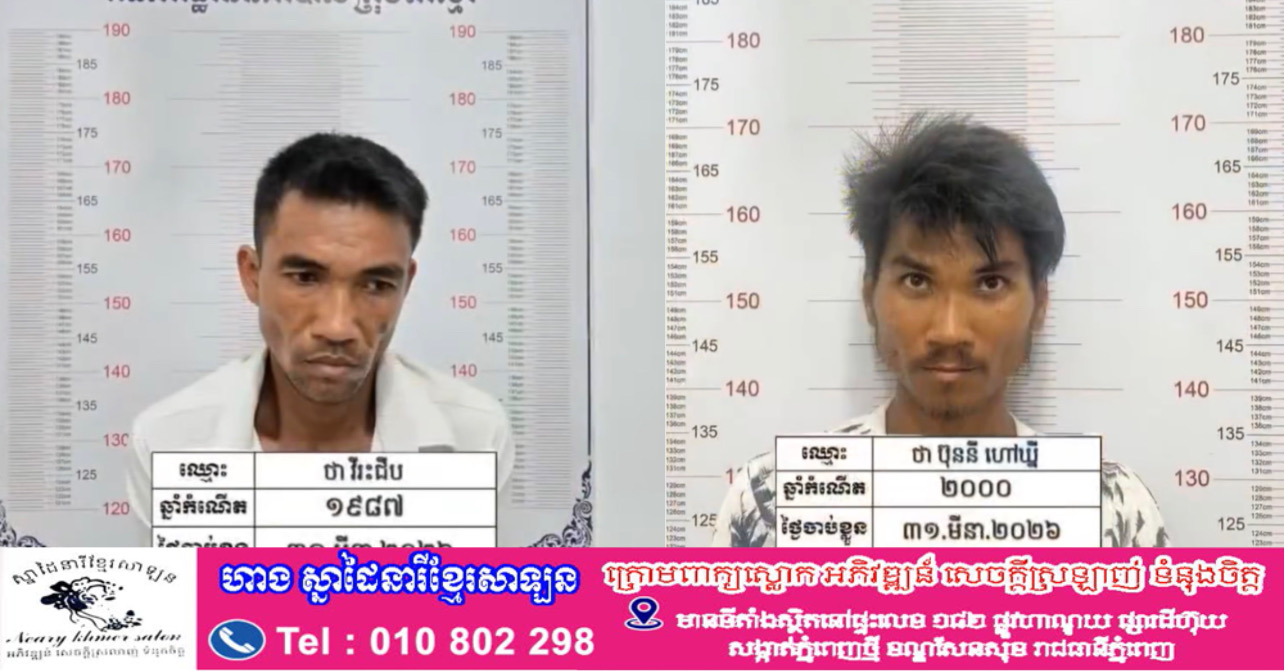 ដោយអនុវត្តតាមបទបញ្ជារបស់ លោកឧត្តមសេនីយ៍ទោ ឈឿន សុចិត្ត ស្នងការ នៃស្នងការដ្ឋាននគរបាលខេត្តកណ្តាល នៅថ្ងៃទី១ខែមេសាឆ្នាំ២០២៦ កម្លាំងជំនាញនៃអធិការដ្ឋាននគរបាលក្រុងតាខ្មៅបានធ្វើការឃាត់ខ្លួនជនសង្ស័យ២នាក់ ពាក់ព័ន្ធករណី អំពើលួច(កាត់ខ្សែបង្គោលភ្លើង)និងប្រើប្រាស់នូវសារធាតុញៀន ចំណុចផ្លូវក្រវ៉ាត់ក្រុងទី៣ ភូមិទួលក្រសាំង សង្កាត់រកាខ្ពស់ក្រុងតាខ្មៅ ខេត្តកណ្តាល ជនសង្ស័យទី១-ឈ្មោះ ថា ប៊ុននី ហៅឃ្នី ភេទប្រុស អាយុ២៦ឆ្នាំ មុខរបរមិនពិតប្រាកដ មានទីលំនៅ ភូមិទួលក្រសាំង សង្កាត់រកាខ្ពស់ ក្រុងតាខ្មៅ ខេត្តកណ្តាល ទី២-ឈ្មោះ ថា វីវះជិប ភេទប្រុស អាយុ៣៩ឆ្នាំ មុខរបរ មិនពិតប្រាកដ មានទីលំនៅ ភូមិទួលក្រសាំង សង្កាត់រកាខ្ពស់ ក្រុងតាខ្មៅ ខេត្តកណ្តាល ។ ជនសង្ស័យទាំង២នាក់មានសារធាតុញៀន(+) ។