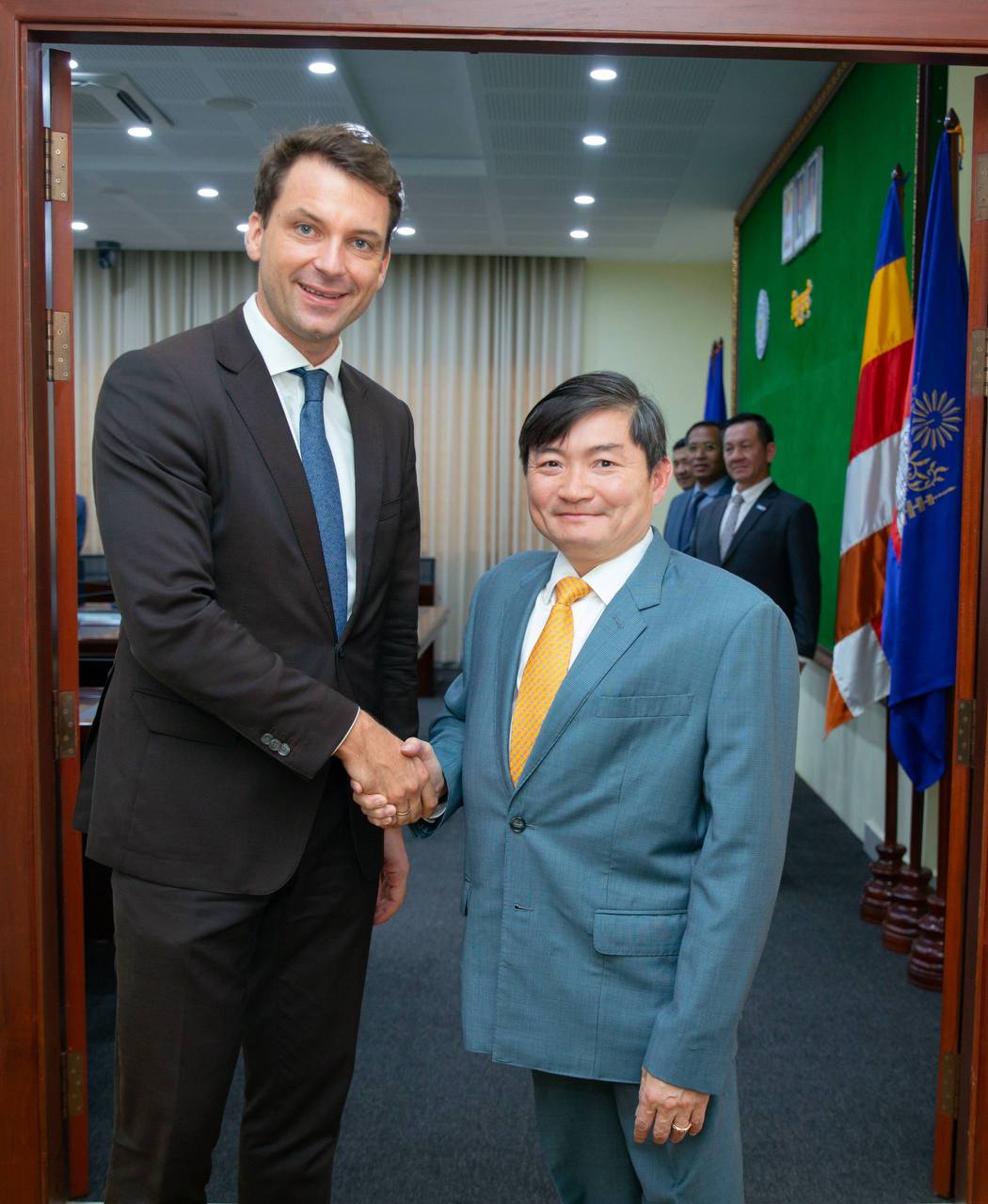 ភ្នំពេញ៖ លោក ហេង សួរ រដ្ឋមន្ត្រីក្រសួងការងារ និងបណ្ដុះបណ្ដាលវិជ្ជាជីវៈ បានទទួលជួបសម្ដែងការគួរសមជាមួយលោក Christoph Weigelmeier ភារធារីស្តីទីនៃស្ថានទូតសាធារណរដ្ឋសហព័ន្ធអាល្លឺម៉ង់ប្រចាំកម្ពុជា និងលោកបណ្ឌិត Christoph Hoffmann អតីតសមាជិកសភាអាល្លឺម៉ង់ នាថ្ងៃទី១ ខែមេសា ឆ្នាំ២០២៦ នេះ នៅទីស្តីការក្រសួង ដើម្បីពិភាក្សាស្វែងរកឱកាសបង្កើតគំនិតផ្តួចផ្តើមដែលគាំទ្រដល់ការលើកកម្ពស់ការអភិវឌ្ឍធនធានមនុស្សនៅកម្ពុជា ដែលរួមមានទាំងសិក្ខាកាម ដែលអាចមានឱកាសទៅធ្វើកម្មសិក្សា និងកម្មសិក្សាឆ្លាស់នៅអាល្លឺម៉ង់។