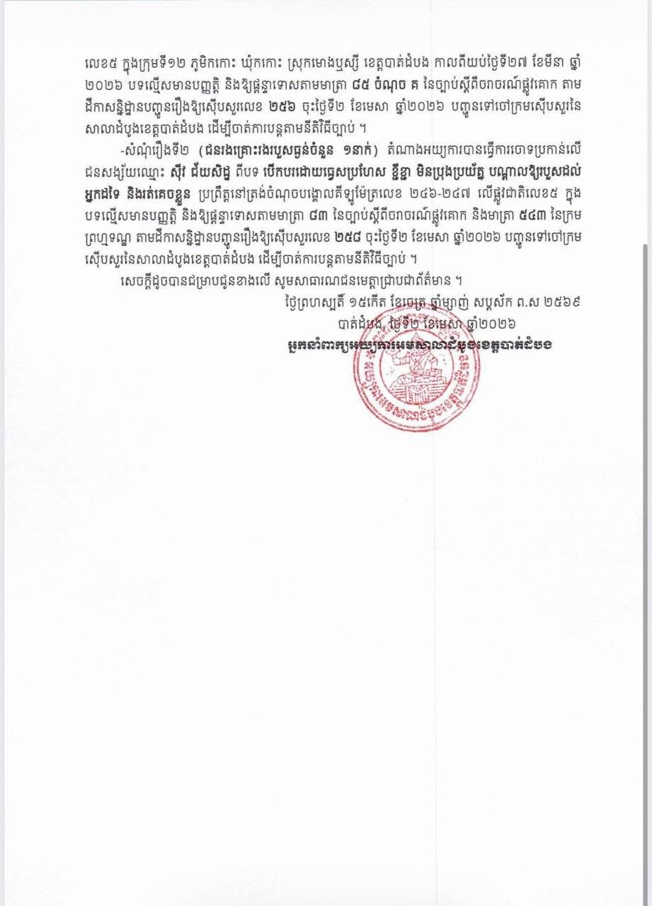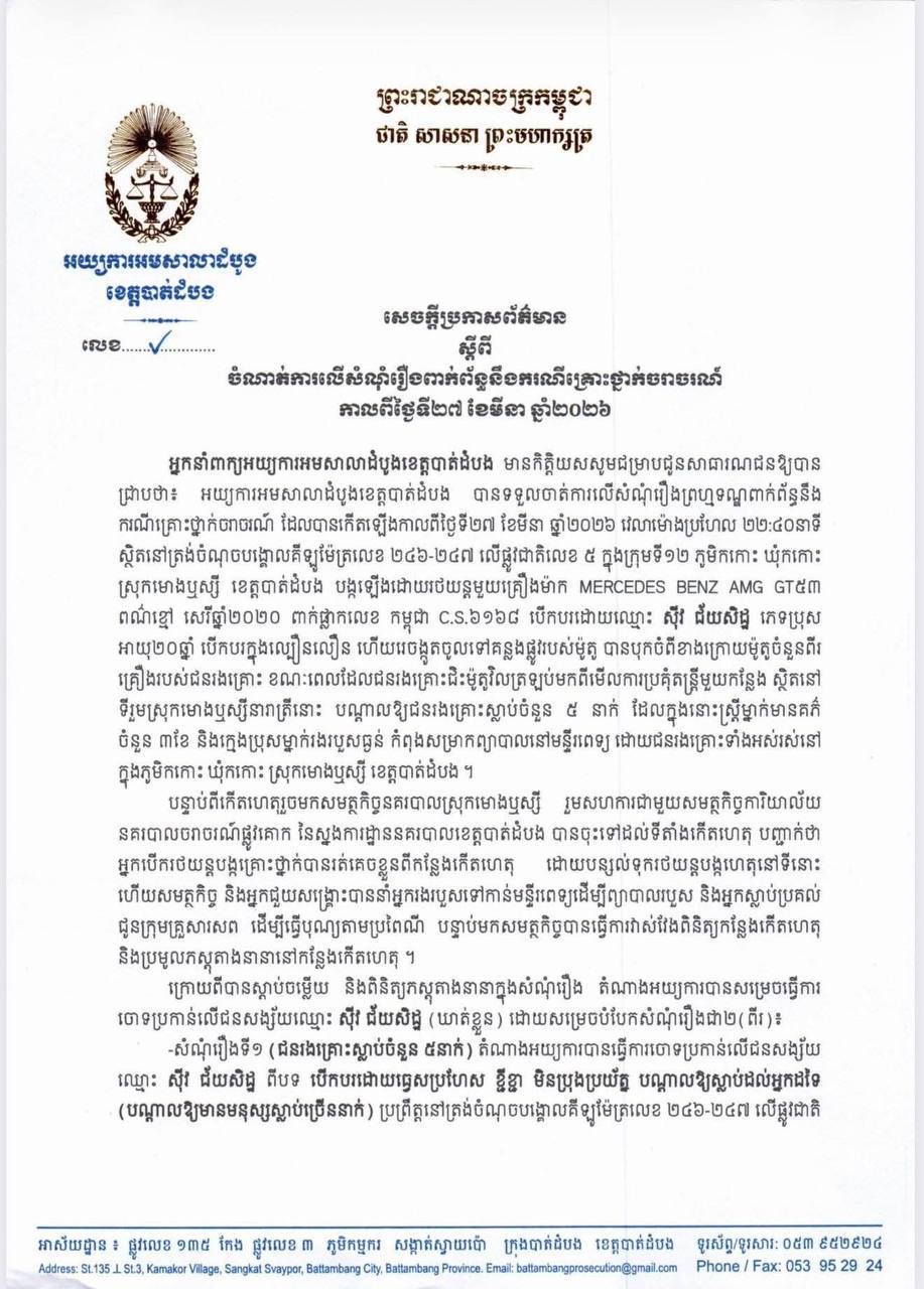 ខេត្តបាត់ដំបង​៖​ អ្នកនាំពាក្យអយ្យការអមសាលាដំបូងខេត្តបាត់ដំបង នៅថ្ងៃទី​០២​ ខែមេសា​ ឆ្នាំ​២០២៦នេះ​ មានកិត្តិយសសូមជម្រាបជូនសាធារណជនឱ្យបាន ជ្រាបថា៖ អយ្យការអមសាលាដំបូងខេត្តបាត់ដំបង បានទទួលចាត់ការលើសំណុំរឿងព្រហ្មទណ្ឌពាក់ព័ន្ធនឹង ករណីគ្រោះថ្នាក់ចរាចរណ៍ ដែលបានកើតឡើងកាលពីថ្ងៃទី២៧ ខែមីនា ឆ្នាំ២០២៦ វេលាម៉ោងប្រហែល ២២:៤០នាទី ស្ថិតនៅត្រង់ចំណុចបង្គោលគីឡូម៉ែត្រលេខ ២៤៦-២៤៧ លើផ្លូវជាតិលេខ ៥ ក្នុងក្រុមទី១២ ភូមិកកោះ ឃុំកកោះ ស្រុកមោងឬស្សី ខេត្តបាត់ដំបង បង្កឡើងដោយរថយន្តមួយគ្រឿងម៉ាក MERCEDES BENZ AMG GT៥៣ ពណ៌ខ្មៅ សេរីឆ្នាំ២០២០ ពាក់ផ្លាកលេខ កម្ពុជា C.S.៦១៦៨ បើកបរដោយឈ្មោះ ស៊ីវ ជ័យសិដ្ឋ ភេទប្រុស អាយុ២០ឆ្នាំ បើកបរក្នុងល្បឿនលឿន ហើយរេចង្កូតចូលទៅគន្លងផ្លូវរបស់ម៉ូតូ បានបុកចំពីខាងក្រោយម៉ូតូចំនួនពីរ គ្រឿងរបស់ជនរងគ្រោះ ខណៈពេលដែលជនរងគ្រោះជិះម៉ូតូវិលត្រឡប់មកពីមើលការប្រគុំតន្ត្រីមួយកន្លែង ស្ថិតនៅ ទីរួមស្រុកមោងឬស្សីនារាត្រីនោះ បណ្តាលឱ្យជនរងគ្រោះស្លាប់ចំនួន ៥ នាក់ ដែលក្នុងនោះស្ត្រីម្នាក់មានគភ៌ ចំនួន ៣ខែ និងក្មេងប្រុសម្នាក់រងរបួសធ្ងន់ កំពុងសម្រាកព្យាបាលនៅមន្ទីរពេទ្យ ដោយជនរងគ្រោះទាំងអស់រស់នៅ ក្នុងភូមិកកោះ ឃុំកកោះ ស្រុកមោងឬស្សី ខេត្តបាត់ដំបង ។