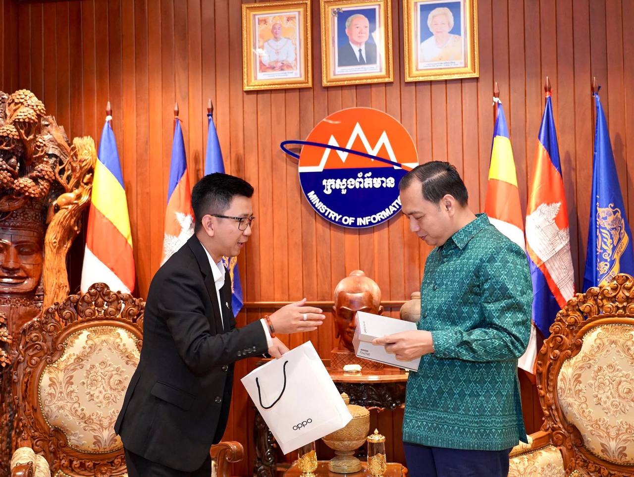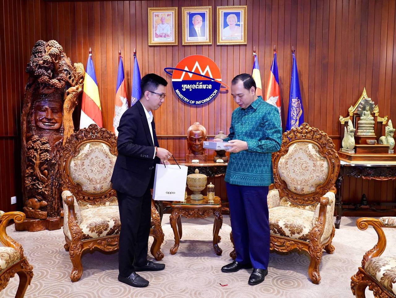 លោករដ្ឋមន្ត្រី នេត្រ ភក្ត្រា អនុញ្ញាតឱ្យលោក ទូច ស៊ាងអ៊ុយ (Steven) នាយកគ្រប់គ្រងផែនការ និងទីផ្សារ ជាតំណាងក្រុមហ៊ុន OPPO ចូលជួបសម្ដែងការគួរសម និងពិភាក្សាការងារ ព្រមទាំងនាំយកនូវកាដូជូនដើម្បីអបអរសាទរពិធីបុណ្យចូលឆ្នាំថ្មីប្រពៃណីជាតិខ្មែរ