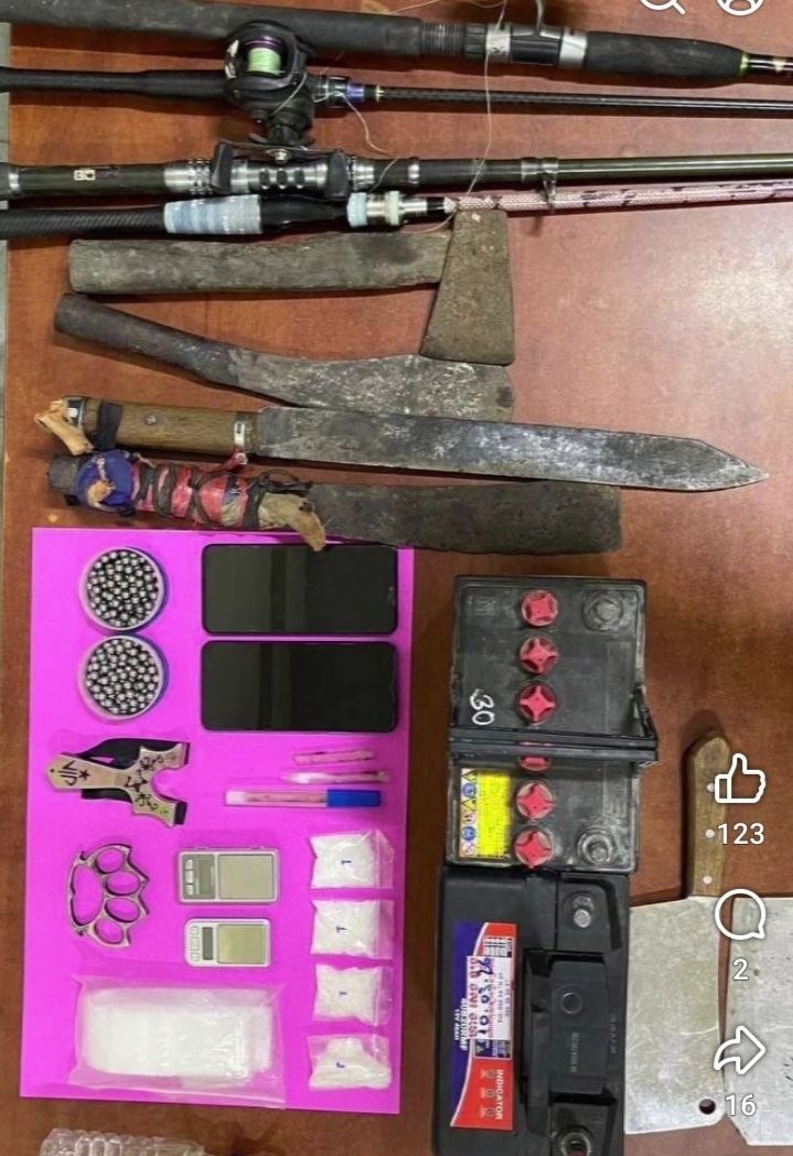 វត្ថុតាងដកហូតរួមមាន ÷ម្សៅក្រាមពណ៌សថ្លាម៉ាទឹកកក (ice) ចំនួន ០៤កញ្ចប់ ទម្ងន់ ៤៨.៣២ក្រាម(ថ្លឹងទាំងសំបក) ,គ្រាប់ជំពាមកៅស៊ូមួយចំនួន , ស្នាប់ដៃចំនួន ០១ , កង់ចំនួន ០២គ្រឿង , ទូរស័ព្ទចំនួន ០២គ្រឿង , ជញ្ជីងសម្រាប់ថ្លឹងគ្រឿងញៀន០១ គ្រឿង , ជំពាមកៅស៊ូ០១ ,ម៉ូតូ០១គ្រឿង ,ឧបករណ៍សម្រាប់ប្រើប្រាស់គ្រឿងញៀនចំនួន ០២ ,ថង់សម្រាប់វេចខ្ចប់គ្រឿងញៀនមួយចំនួន ,កាំបិត ០៤ដើម ,ដាវ ០១ដើម , អាគុយ០ ២ ,ធុងបាស០១ , បំពង់សម្រាប់ជក់គ្រឿងញៀនមួយ ចំនួន ,ពូថៅ០១ដើម ,ដងសន្ទូច០៤។