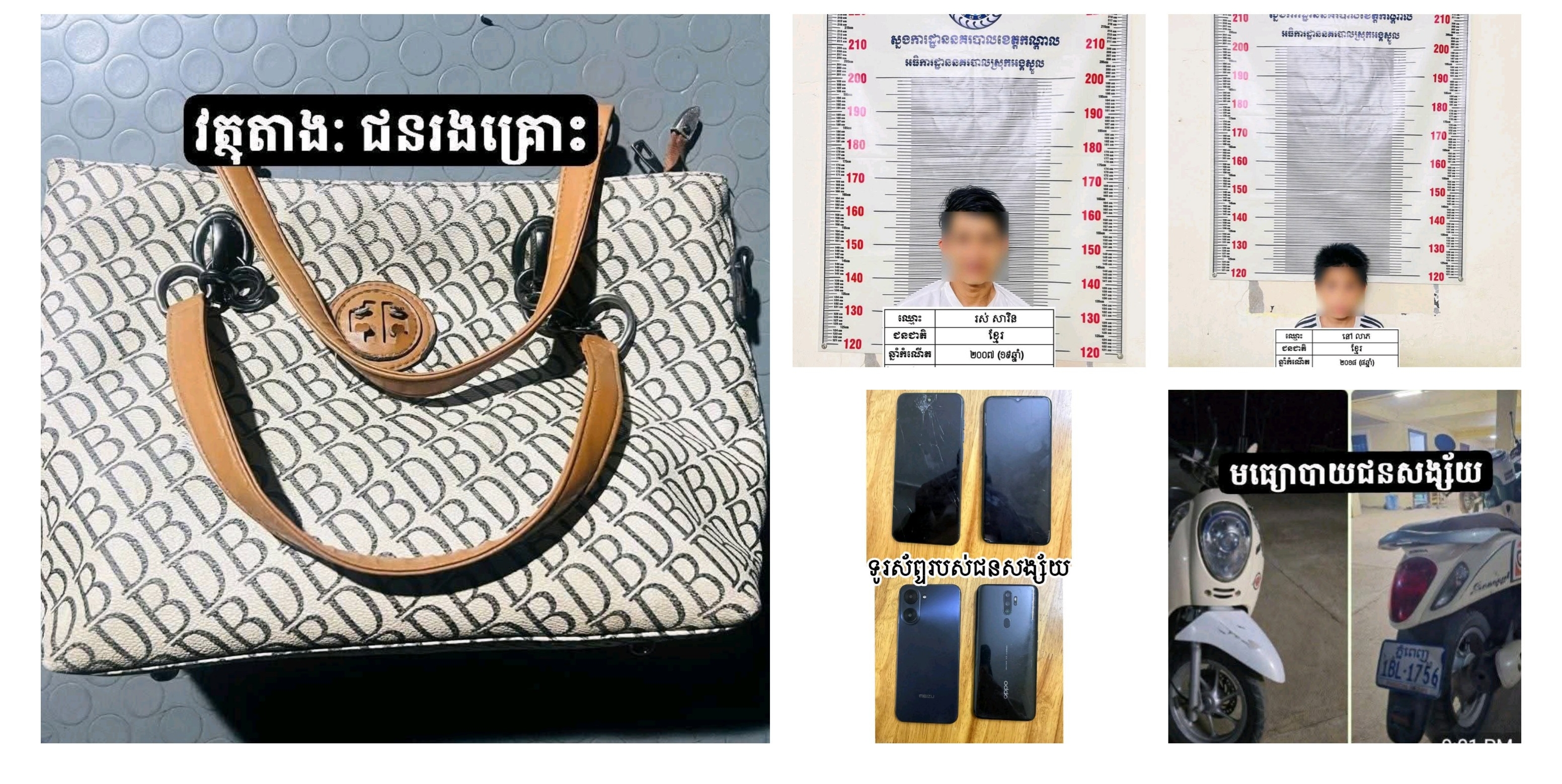 លោកវរសេនីយ៍ឯក មាន សំណាង អធិការនគរបាលស្រុកអង្គស្នួល បានឲ្យដឹងថា ជនសង្ស័យទាំង ២នាក់ ដែលត្រូវឃាត់ខ្លួនរួមមានទី១ ឈ្មោះ រស់ សារិន ភេទ ប្រុស អាយុ១៩ឆ្នាំ មានសារធាតុញៀនក្នុងទឹកនោមវិជ្ជមាន រស់នៅសង្កាត់ឃ្មួញ ខណ្ឌសែនសុខ និងទី២ ឈ្មោះ នៅ លាភ ភេទប្រុស អាយុ៨ឆ្នាំ គ្មានសារធាតុញៀនក្នុងទឹកនោម រស់នៅសង្កាត់ច្បារអំពៅ ខណ្ឌច្បារអំពៅ។ ក្នុងប្រតិបត្តិការនេះ សមត្ថកិច្ចបានដកហូតវត្ថុតាងរួមមានម៉ូតូ ១គ្រឿង ម៉ាកហុងដាស្គូពីពណ៌ស ពាក់ផ្លាកលេខ ភ្នំពេញ 1BL-1756 ព្រមទាំងទូរស័ព្ទដៃ ២គ្រឿង។ ដោយឡែកជនរងគ្រោះឈ្មោះ ស្រី សុម៉ាលី ភេទស្រី អាយុ២៨ឆ្នាំ ជាអាជីវករ រស់នៅភូមិថ្មគោល ឃុំសំបូរ ស្រុកសំរោងទង មិនមានការបាត់បង់ទ្រព្យសម្បត្តិ និងមិនបានដាក់ពាក្យបណ្ដឹងនោះទេ។
