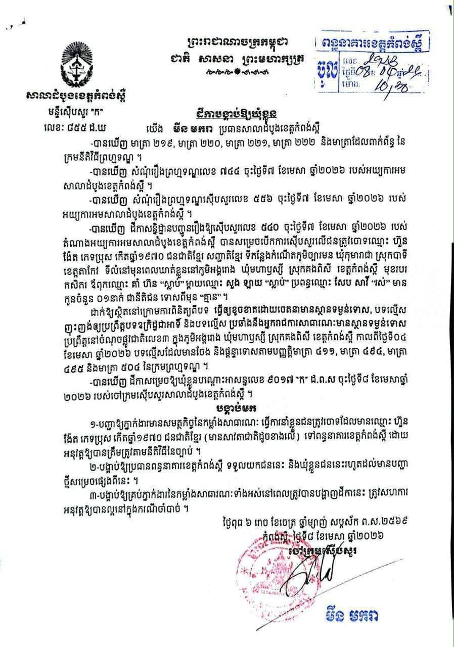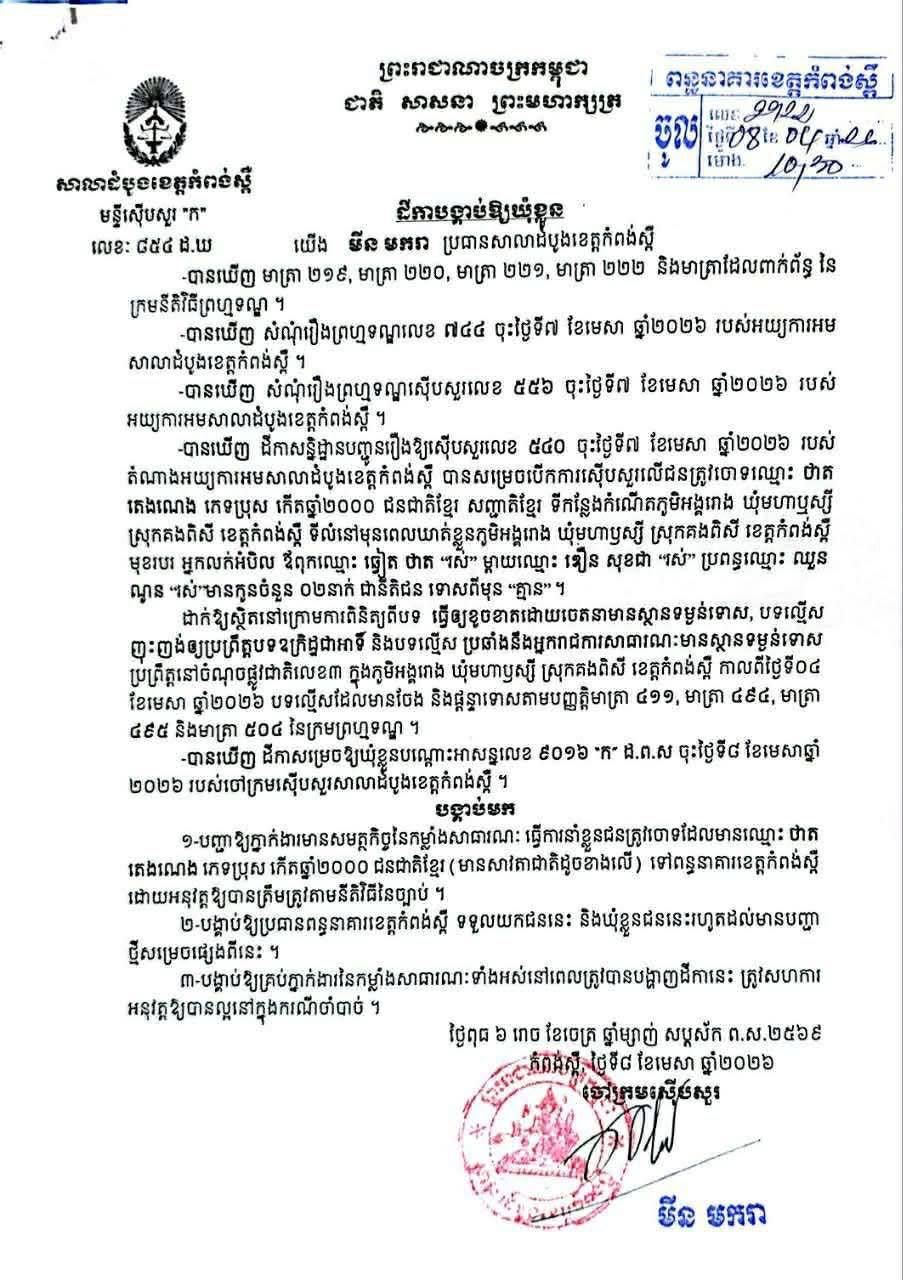 ចៅក្រម ស៊េីបសួរ សាលា ដំបូង ខេត្ត កំពង់ ស្ពឺ ចេញ ដីកា បង្គាប់ ឲ្យ ឃុំខ្លួន ឈ្មោះ ថាត តេងណេង និង ឈ្មោះ ហ៊ួន ង៉ែត