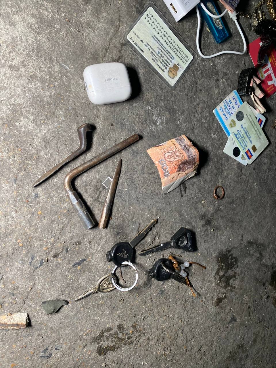 បន្ទាប់មកក៏ឆែកឆេករកឃេីញសម្ភារៈកាច់សោ កម៉ូតូមួយចំនួននៅក្នុងខ្លួនជនសង្ស័យ។