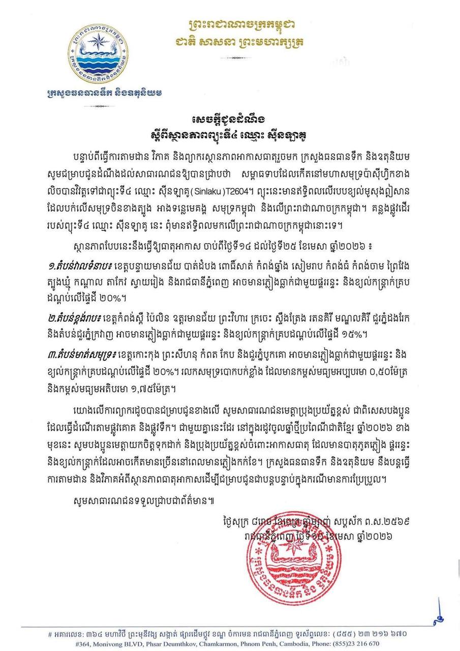 ភ្នំពេញ ៖ បន្ទាប់ពីធ្វើការតាមដាន វិភាគ និងព្យាករស្ថានភាពអាកាសធាតុរួចមក ក្រសួងធនធានទឹក និងឧតុនិយម សូមជម្រាបជូនដំណឹងដល់សាធារណជនឱ្យបានជ្រាបថា សម្ពាធទាបដែលកើតនៅមហាសមុទ្រប៉ាស៊ីហ្វិកខាង លិចបានវិវត្តទៅជាព្យុះទី៤ ឈ្មោះ ស៊ីនឡាគូ (Sinlaku) T2604។ ព្យុះនេះមានឥទ្ធិពលលើរបបខ្យល់មូសុងឦសាន ដែលបក់លើសមុទ្រចិនខាងត្បូង អាងទន្លេមេគង្គ សមុទ្រកម្ពុជា និងលើព្រះរាជាណាចក្រកម្ពុជា។ គន្លងផ្លូវដើរ របស់ព្យុះទី៤ ឈ្មោះ ស៊ីនឡាគូ នេះ ពុំមានឥទ្ធិពលមកលើព្រះរាជាណាចក្រកម្ពុជានោះទេ។