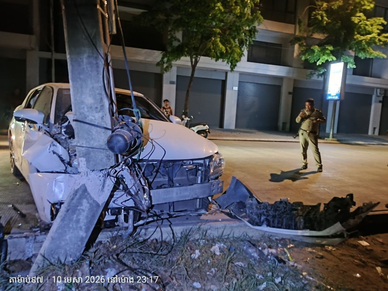 ភ្នំពេញ÷ រថយន្ត Lexus CT- 200h មួយគ្រឿងបើកបរក្នុងល្បឿនលឿនបានរេចង្កូតទៅបុកបង្គោលភ្លើងថ្មមួយដើមបណ្តាលឲ្យបាក់ ចំណែករថយន្តរងការខូចខាតយ៉ាងដំណំនិងបណ្ដាលឲ្យបុរសជាប្ដីអ្នកបើកបររងរបួស។