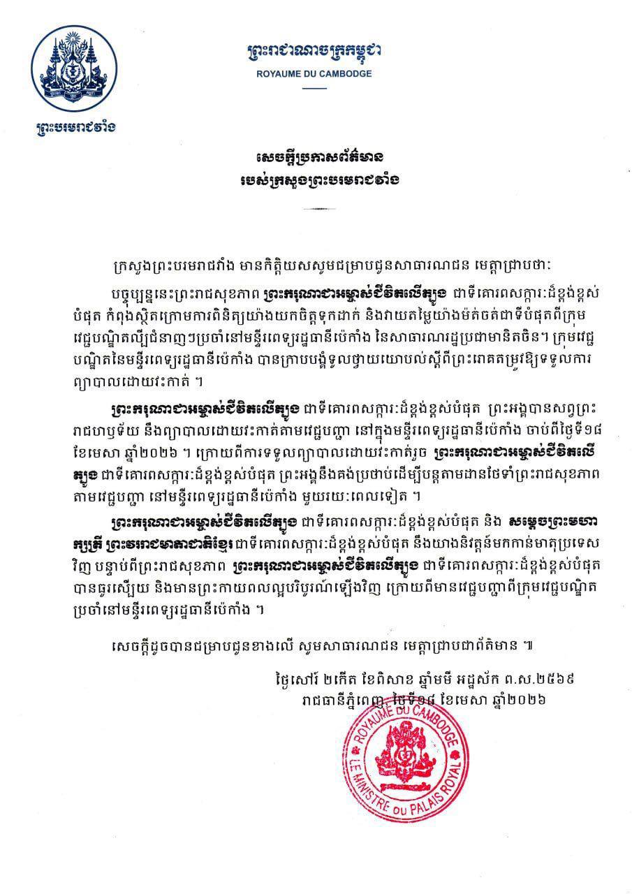ភ្នំពេញ៖ ក្រសួងព្រះបរមរាជវាំង នៅថ្ងៃទី១៨ ខែមេសា ឆ្នាំ២០២៦នេះ មានកិត្តិយសសូមជម្រាបជូនសាធារណជន មេត្តាជ្រាបថា៖ បច្ចុប្បន្ននេះព្រះរាជសុខភាព ព្រះករុណាជាអម្ចាស់ជីវិតលើត្បូង ជាទីគោរពសក្ការៈដ៏ខ្ពង់ខ្ពស់ បំផុត កំពុងស្ថិតក្រោមការពិនិត្យយ៉ាងយកចិត្តទុកដាក់ និងវាយតម្លៃយ៉ាងម៉ត់ចត់ជាទីបំផុតពីក្រុម វេជ្ជបណ្ឌិតល្បីជំនាញៗប្រចាំនៅមន្ទីរពេទ្យរដ្ឋធានីប៉េកាំង នៃសាធារណរដ្ឋប្រជាមានិតចិន។ ក្រុមវេជ្ជ បណ្ឌិតនៃមន្ទីរពេទ្យរដ្ឋធានីប៉េកាំង បានក្រាបបង្គំទូលថ្វាយយោបល់ស្តីពីព្រះរោគតម្រូវឱ្យទទួលការ ព្យាបាលដោយវះកាត់ ។