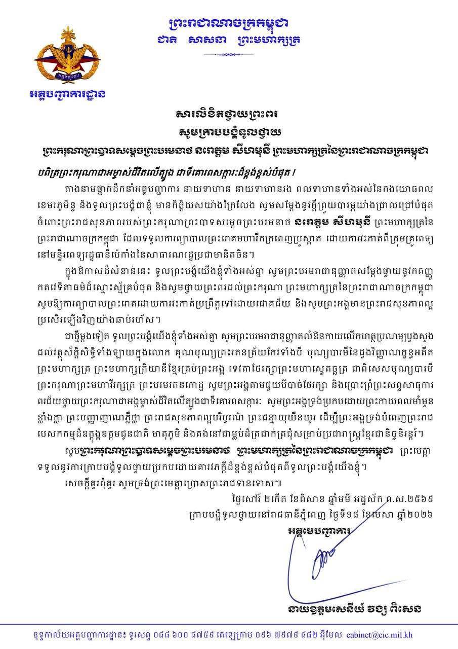 ទូលព្រះបង្គំជាខ្ញុំ សូមសម្តែងនូវក្តីបារម្ភ ក្រោយពីទទួលព័ត៌មានថា ព្រះរោគមហារីកក្រពេញប្រូស្តាត (prostate cancer) របស់ព្រះករុណា ជាអម្ចាស់ជីវិតលើត្បូង ជាទីគោរពសក្ការៈដ៏ខ្ពង់ខ្ពស់បំផុត តម្រូវឱ្យព្រះអង្គទទួលការព្យាបាលដោយការវះកាត់តាមវេជ្ជបញ្ជា នៅមន្ទីរពេទ្យនារដ្ឋធានីប៉េកាំង នៃសាធារណរដ្ឋប្រជាមានិតចិន និងបន្តគង់ប្រថាប់នៅទីនោះមួយរយៈពេល ដើម្បីតាមដានត្រួតពិនិត្យ និងព្យាបាលព្រះរោគ ចាប់ពីថ្ងៃទី១៨ ខែមេសា ឆ្នាំ២០២៦នេះ។