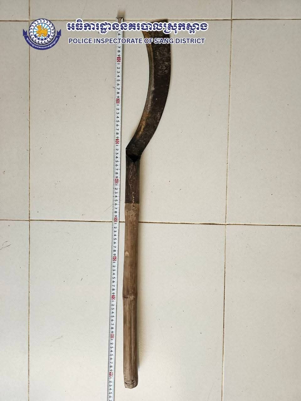 វត្ថុតាងចាប់យកកាំបិតផ្គាក់ចំនួន ០១ ដេីមផ្លែដែកដងធ្វើអំពីឫស្សី មានប្រវែង៩០សង់ទីមែត្រ។