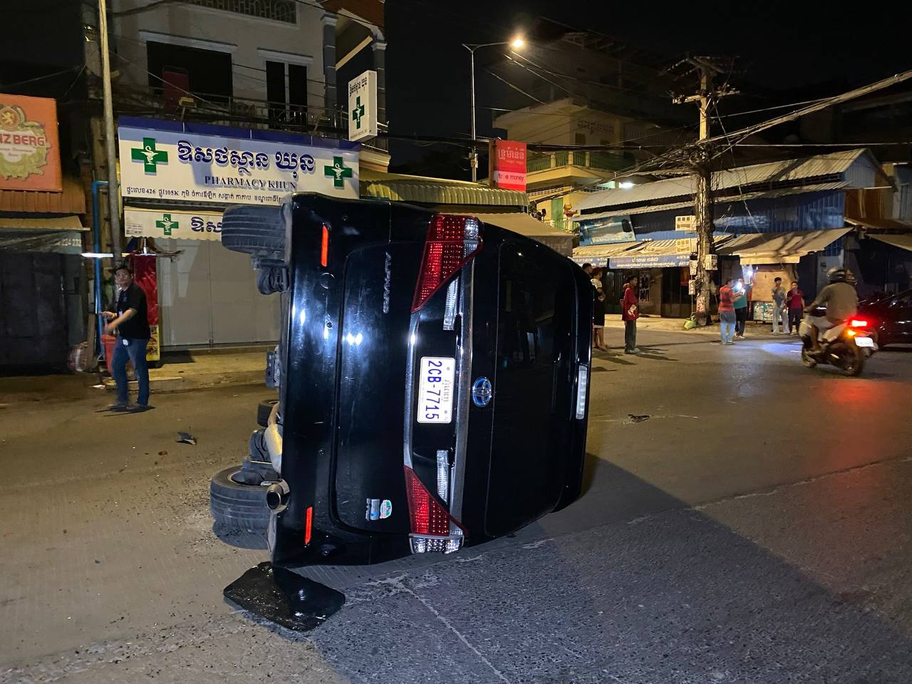 ភ្នំពេញ៖ បុរសម្នាក់បេីករថយន្ដ TOYOTA Prius បុកជាមួយរថយន្ត TOYOTA ALPHARDនៅត្រង់ផ្លូវបំបែកជាបួនបណ្តាលឱ្យរថយន្ត ALPHARD ក្រឡាប់ផ្ងារជេីងម្ខាង។