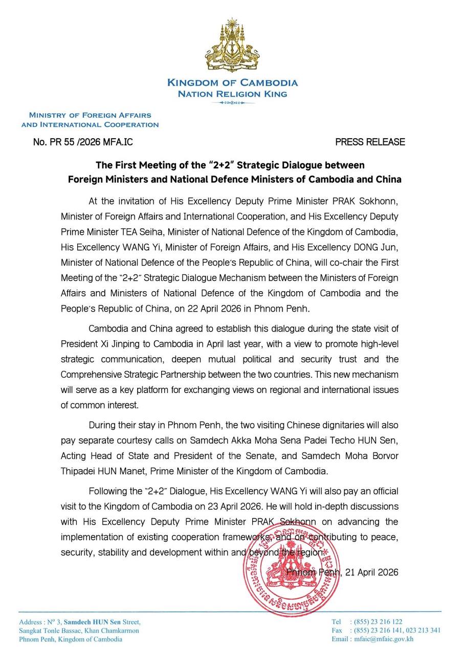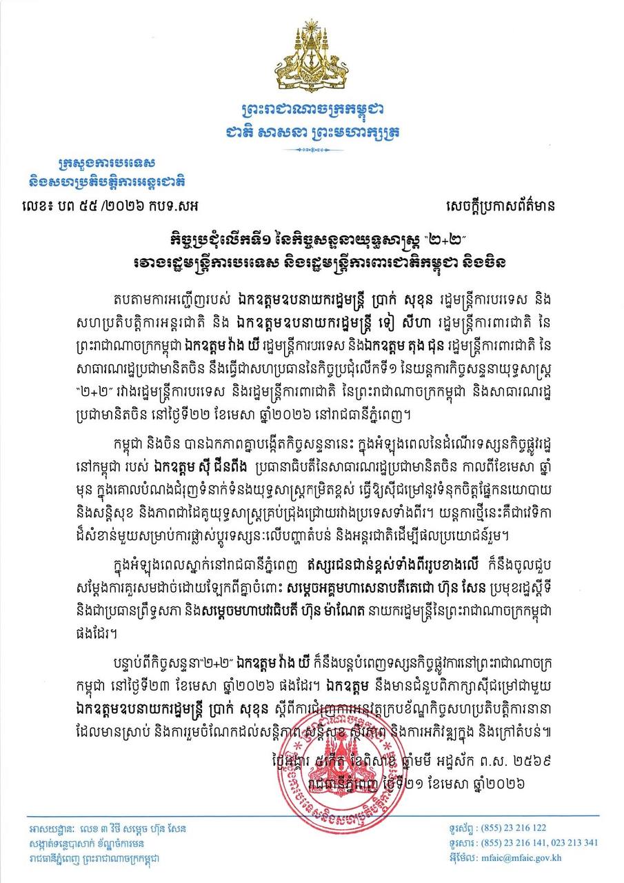 ភ្នំពេញ ៖ តបតាមការអញ្ជើញរបស់ លោកឧបនាយករដ្ឋមន្ត្រី ប្រាក់ សុខុន រដ្ឋមន្ត្រីការបរទេស និង សហប្រតិបត្តិការអន្តរជាតិ និង លោកឧបនាយករដ្ឋមន្ត្រី ទៀ សីហា រដ្ឋមន្ត្រីការពារជាតិ នៃ ព្រះរាជាណាចក្រកម្ពុជា លោក វ៉ាង យី រដ្ឋមន្ត្រីការបរទេស និងលោក តុង ជុន រដ្ឋមន្ត្រីការពារជាតិ នៃ សាធារណរដ្ឋប្រជាមានិតចិន នឹងធ្វើជាសហប្រធាននៃកិច្ចប្រជុំលើកទី១ នៃយន្តការកិច្ចសន្ទនាយុទ្ធសាស្ត្រ “២+២” រវាងរដ្ឋមន្ត្រីការបរទេស និងរដ្ឋមន្ត្រីការពារជាតិ នៃព្រះរាជាណាចក្រកម្ពុជា និងសាធារណរដ្ឋ ប្រជាមានិតចិន នៅថ្ងៃទី២២ ខែមេសា ឆ្នាំ២០២៦ នៅរាជធានីភ្នំពេញ។