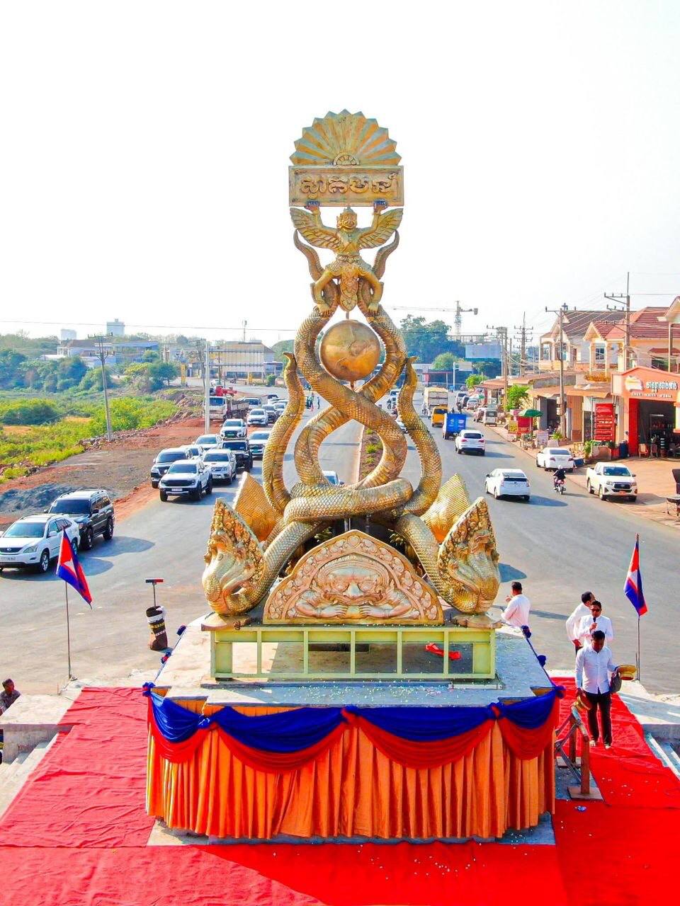 ខេត្តកំពង់ចាម៖ រូបសំណាកនាគព័ន្ធ សាងសង់ អំពីស្ពាន់សុទ្ធ ទំងន់ ៨តោន កម្ពស់ ១០ម៉ែត្រ (បូកទាំងជើងទម្រ ៣ម៉ែត្រ ក្រោមគំនិតផ្តួចផ្តើមកសាងដោយលោក អ៊ុន ចាន់ដា អភិបាលខេត្តកំពង់ចាមនៅចំណុចរង្វង់មូលនាគព័ន្ធចាស់ (ទល់មុខក្លោងទ្វារចូល វត្តប្រាសាទនគរបានជ័យ) ស្ថិតនៅភូមិនគរបាជ័យ ស្រុកកំពង់សៀម ខេត្តកំពង់ចាម ត្រូវបានធ្វើពិធីបញ្ចុះបឋមសិលា ក្រុងពាលីតម្លើងជាថ្មី ដោយ រៀបចំពិធីកាត់ឫសសីមា បញ្ចុះបឋមសិលាតម្លើង និងស្រោចស្រង់បើកព្រះនេត្រនាគ នៅថ្ងៃទី២៣ ខែមេសា ឆ្នាំ២០២៦ នេះក្រោមអធិបតីភាព របស់ លោក ខ្លូត ផន ប្រធានក្រុមប្រឹក្សាខេត្តកំពង់ចាម លោក អ៊ុន ចាន់ដា អភិបាលខេត្តកំពង់ចាម ក្រោមការចូលរួមពីប្រជាពលរដ្ឋជាច្រើនផងដែរ ។