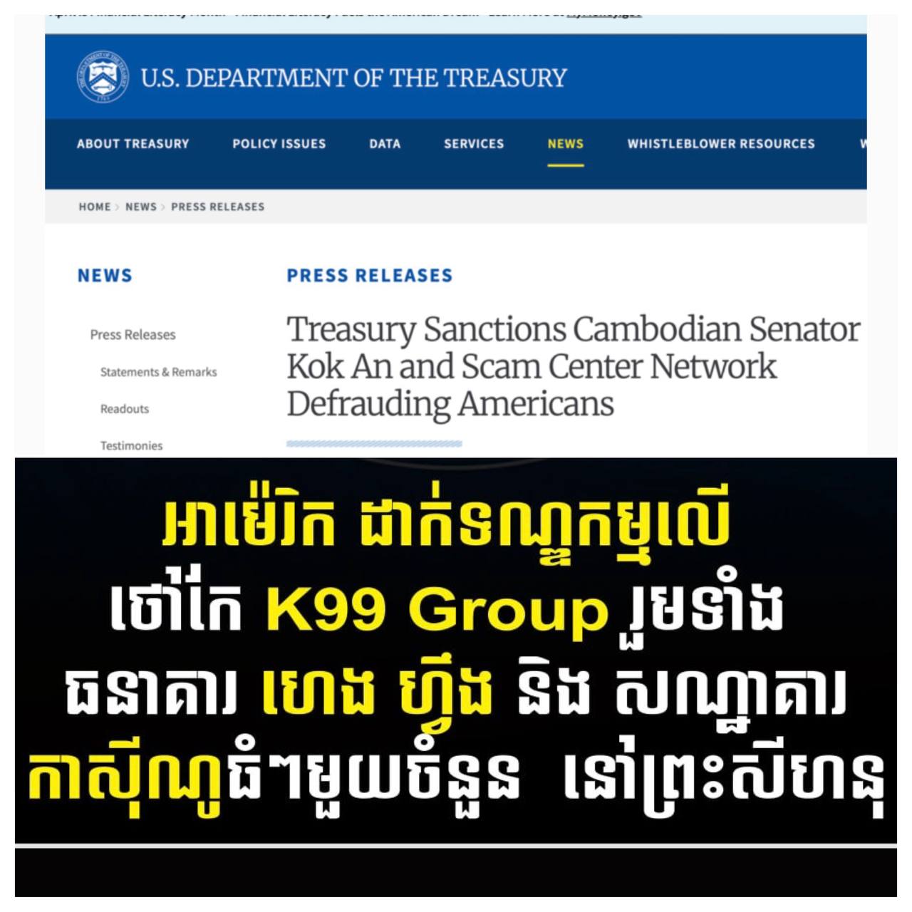 ភ្នំពេញ៖ អាម៉េរិកបានប្រកាសដាក់ទណ្ឌកម្មលើ លោក ឫទ្ធី រស្មី ប្រធានក្រុមហ៊ុន K99 Group រួមទាំងសណ្ឋាគារ Nanhai , សណ្ឋាគារ Xihu , ធនាគារ ហេង ហ្វឹង (Hengfeng Bank), ក្រុមហ៊ុន Bolai Group ព្រមទាំងបុគ្គល និង ក្រុមហ៊ុនពាក់ព័ន្ធសរុបចំនួន២៨ នៅកម្ពុជា។ ការសម្រេចដាក់ទណ្ឌកម្មនេះ ធ្វើឡើងក្រោមការចោទថា ក្រុមហ៊ុនទាំងនេះបានប្រើប្រាស់កាស៊ីណូ រមណីយដ្ឋាន និង អចលនទ្រព្យពាក់ព័ន្ធរបស់ខ្លួន ជាមូលដ្ឋានសម្រាប់ប្រតិបត្តិការសកម្មភាព បទល្មើស Online Scams។
