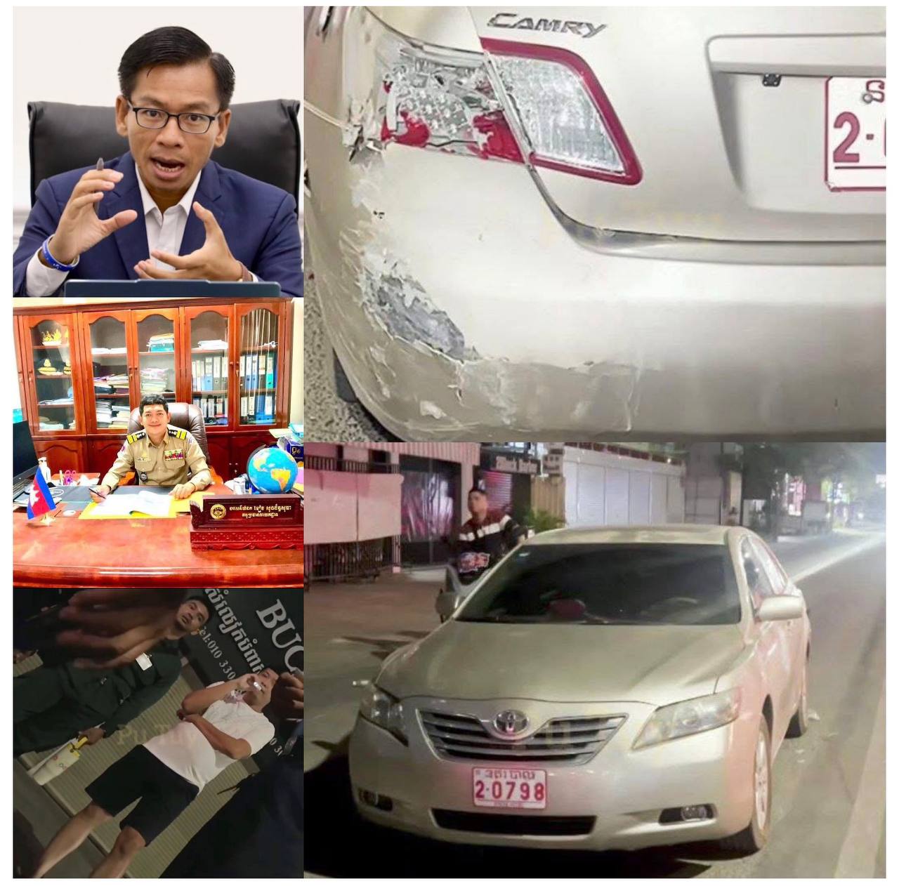 មានឈ្មោះ ខៀវ សុងច័ន្ទសុធា ពាក់ស័ក្ដិ៥ ឋានៈជាអនុប្រធាននាយកដ្ឋាន បានបើករថយន្ដមួយគ្រឿងម៉ាក Camry ពណ៌ស្ករ ពាក់ផ្លាកលេខនគរបាល2-0798 ចតនៅខាងស្ដាំដៃនៃផ្លូវ ពេលនោះស្រាប់តែមានរថយន្ដមួយគ្រឿងទៀត ម៉ាក Chevrolet Tracker ពណ៌ស (អ្នកបើកបរស្ថិតក្នុងស្ថានភាពស្រវឹង) បើកមកប៉ះខាងក្រោយផ្នែកខាងឆ្វេង បណ្ដាលឲ្យបែកស្ដុប និងកំបិតកាងខាងក្រោយ។ បើទោះបីអ្នកបើកបររថយន្ដ Chevrolet Tracker ស្ថិតក្នុងស្ថានភាពស្រវឹងក៏ពិតមែន ប៉ុន្ដែមិនបានគេចវេសពីកន្លែងកើតហេតុនោះ ពោលបានព្យាយាមសម្របសម្រួលដោះស្រាយជាមួយរថយន្ដនគរបាលខាងលើ ដោយចេញថ្លៃសំណងចំនួន៥០០ដុល្លារ។