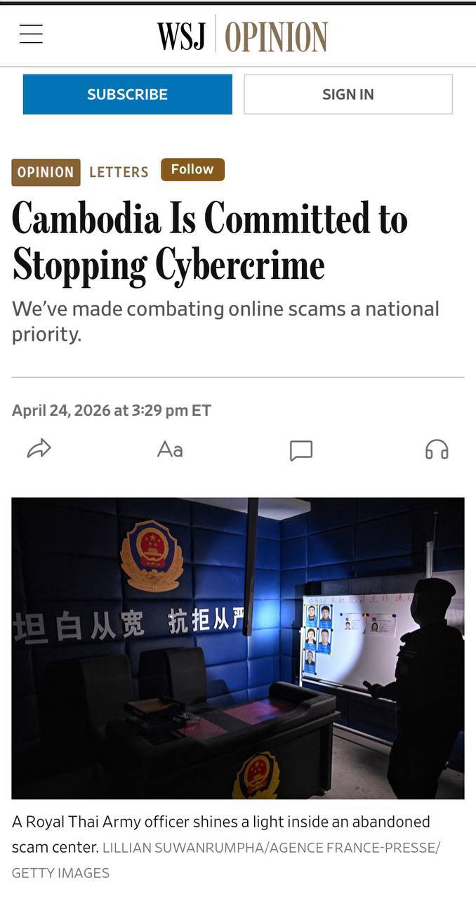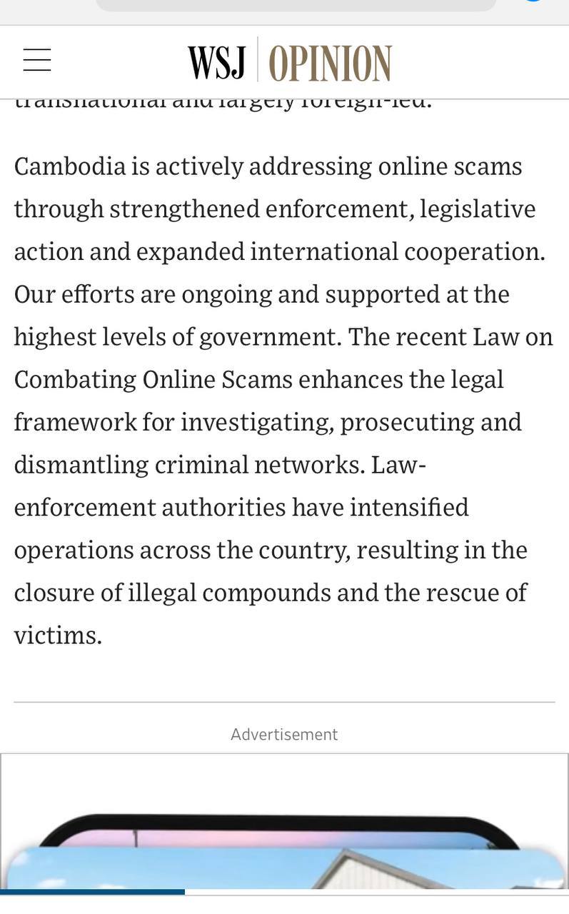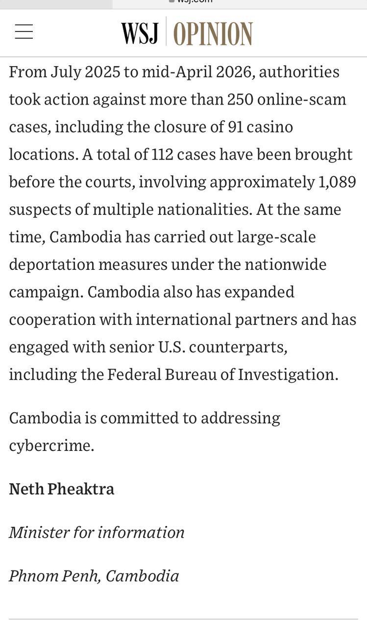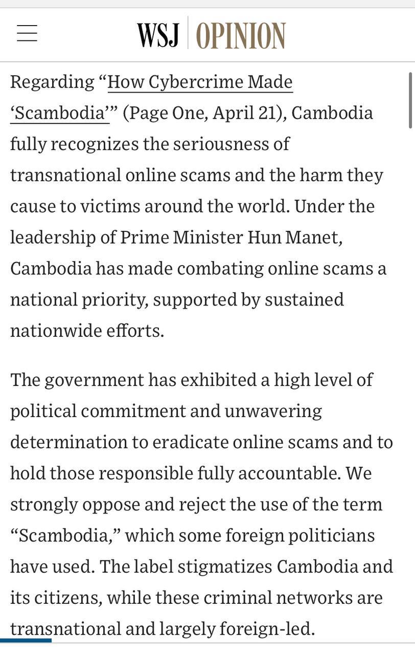 តាមរយៈអត្ថបទទស្សនៈនេះដដែល កាសែតWSJ បានទទួលយកការតវ៉ារបស់កម្ពុជា ដែលបានបើកផ្លូវឱ្យពិភពលោកបានឃើញពីការពិតអំពីជំហរ ឆន្ទៈព្រមទាំងកិច្ចខិតខំរបស់កម្ពុជាក្នុងការប្រយុទ្ធប្រឆាំងឧក្រិដ្ឋកម្មឆបោកតាមប្រព័ន្ធបច្ចេកវិទ្យា។