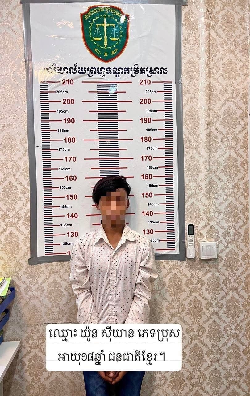 ភ្នំពេញ÷ នៅថ្ងៃទី២៣ ខែមេសា ឆ្នាំ២០២៦ ឈ្មោះ យ៉ូន ធារ៉ា ភេទប្រុស អាយុ១៧ឆ្នាំ ជនជាតិខ្មែរ បានមកដាក់ ពាក្យបណ្ដឹង នៅការិយាល័យព្រហ្មទណ្ឌកម្រិតស្រាល។ នៅថ្ងៃដដែលត្រង់ចំណុចភូមិបាក់ខែង សង្កាត់ព្រែកលាប ខណ្ឌជ្រោយចង្វារ រាជធានីភ្នំពេញ កម្លាំងជំនាញការិយាល័យព្រហ្មទណ្ឌកម្រិតស្រាល បានស៊ើបអង្កេតស្រាជ្រាវ និងឃាត់ខ្លួនជនសង្ស័យម្នាក់ ឈ្មោះ យ៉ូន ស៊ីយាន ភេទប្រុស អាយុ១៨ឆ្នាំ ជនជាតិខ្មែរ ស្នាក់នៅ ហាងហេងហេងព្រះច័ន្ទពេញវង្ស ភូមិបាក់ខែង សង្កាត់ព្រែក លៀប ខណ្ឌជ្រោយចង្វារ រាជធានីភ្នំពេញ។