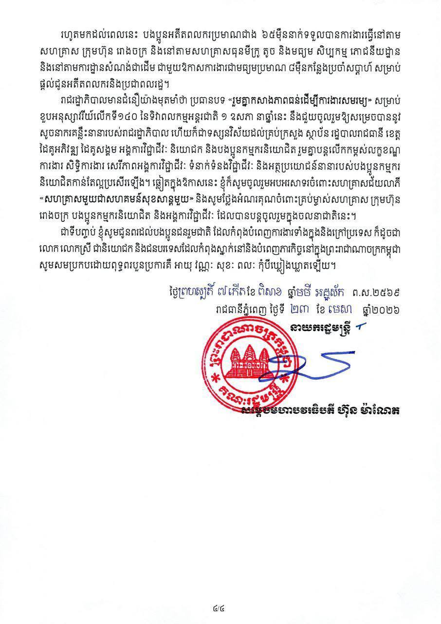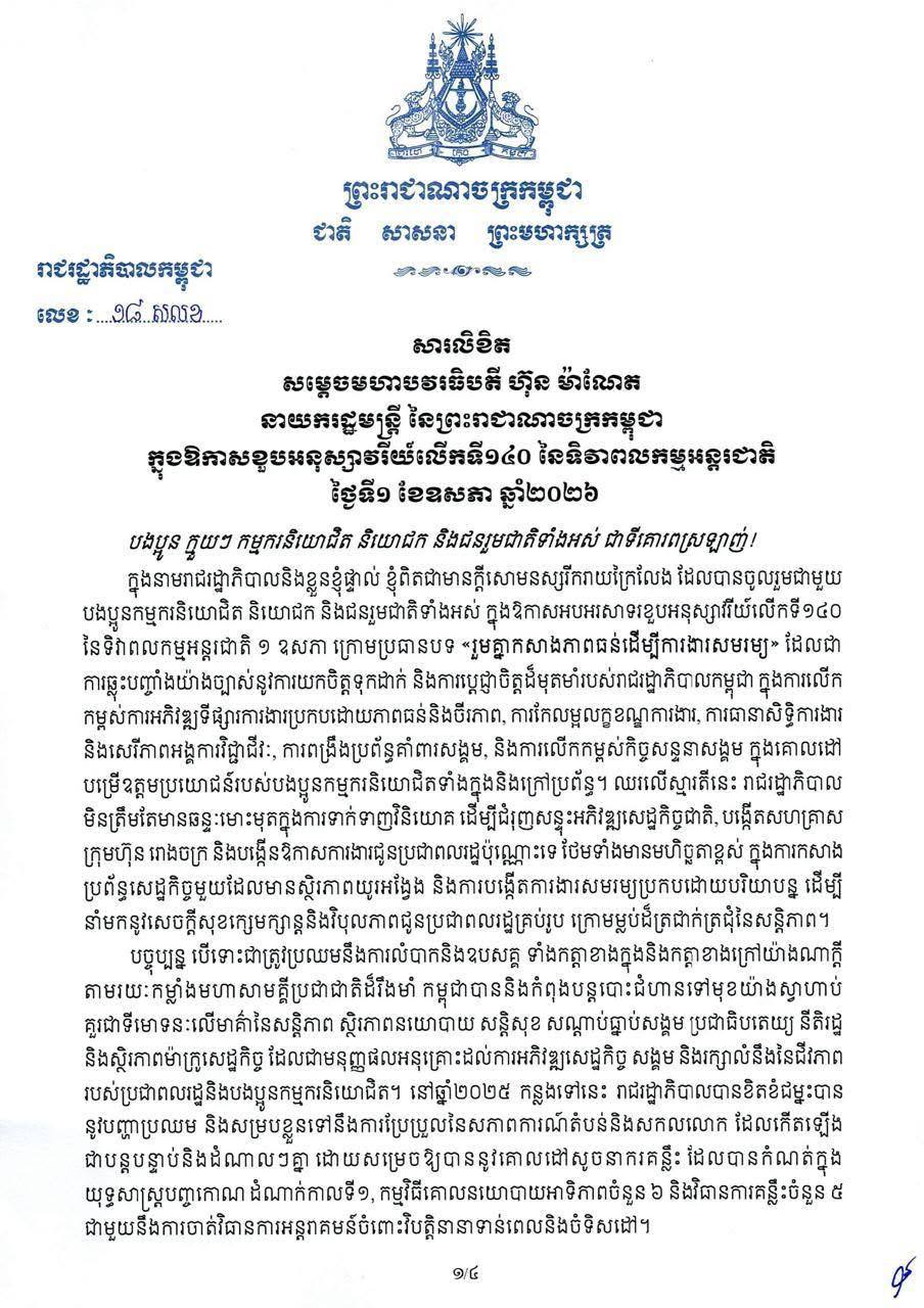 ភ្នំពេញ ៖ យោងតាមសារលិខិតរបស់សម្តេចធិបតី ហ៊ុន ម៉ាណែត នាយករដ្ឋមន្ត្រី នៃព្រះរាជាណាចក្រកម្ពុជា ក្នុងឱកាសខួបអនុស្សាវរីយ៍លើកទី១៤០ នៃទិវាពលកម្មអន្តរជាតិ ថ្ងៃទី១ ខែឧសភា ឆ្នាំ២០២៦បានឱ្យដឹងថា បច្ចុប្បន្ន បើទោះជាត្រូវប្រឈមនឹងការលំបាកនិងឧបសគ្គ ទាំងកត្តាខាងក្នុងនិងកត្តាខាងក្រៅយ៉ាងណាក្តី តាមរយៈកម្លាំងមហាសាមគ្គីប្រជាជាតិដ៏រឹងមាំ កម្ពុជាបាននិងកំពុងបន្តបោះជំហានទៅមុខយ៉ាងស្វាហាប់ គួរជាទីមោទនៈលើមាគ៌ានៃសន្តិភាព ស្ថិរភាពនយោបាយ សន្តិសុខ សណ្តាប់ធ្នាប់សង្គម ប្រជាធិបតេយ្យ នីតិរដ្ឋ និងស្ថិរភាពម៉ាក្រូសេដ្ឋកិច្ច ដែលជាមនុញ្ញផលអនុគ្រោះដល់ការអភិវឌ្ឍសេដ្ឋកិច្ច សង្គម និងរក្សាលំនឹងនៃជីវភាពរបស់ប្រជាពលរដ្ឋនិងបងប្អូនកម្មករនិយោជិត។