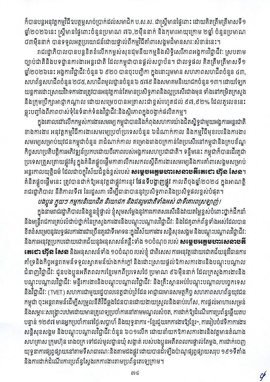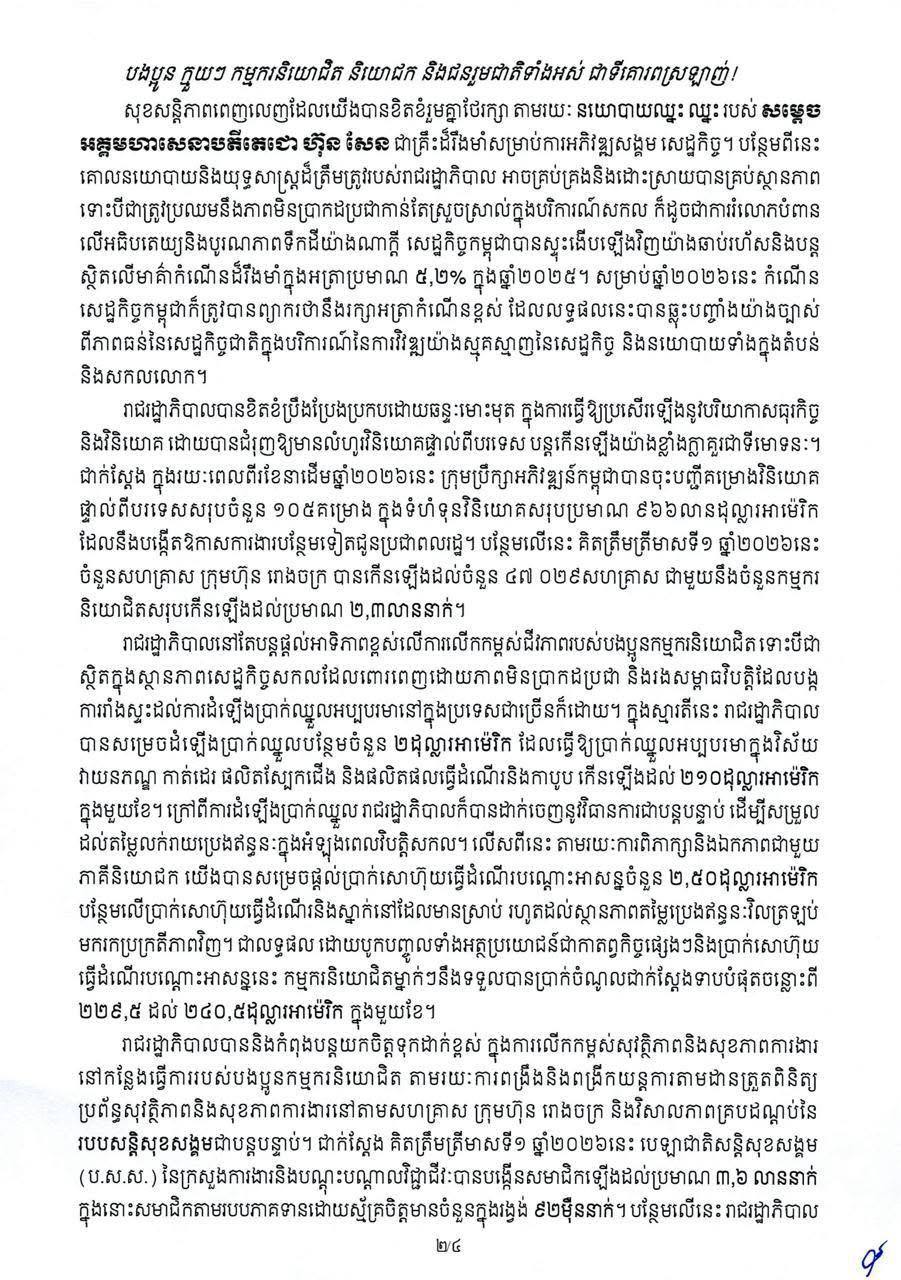 គួរបញ្ជាក់ផងដែរថា សុខសន្តិភាពពេញលេញដែលយើងបានខិតខំរួមគ្នាថែរក្សា តាមរយៈ នយោបាយឈ្នះ ឈ្នះ របស់ សម្តេច អគ្គមហាសេនាបតីតេជោ ហ៊ុន សែន ជាគ្រឹះដ៏រឹងមាំសម្រាប់ការអភិវឌ្ឍសង្គម សេដ្ឋកិច្ច។ បន្ថែមពីនេះ គោលនយោបាយនិងយុទ្ធសាស្ត្រដ៏ត្រឹមត្រូវរបស់រាជរដ្ឋាភិបាល អាចគ្រប់គ្រងនិងដោះស្រាយបានគ្រប់ស្ថានភាព ទោះបីជាត្រូវប្រឈមនឹងភាពមិនប្រាកដប្រជាកាន់តែស្រួចស្រាល់ក្នុងបរិការណ៍សកល ក៏ដូចជាការរំលោភបំពាន លើអធិបតេយ្យនិងបូរណភាពទឹកដីយ៉ាងណាក្តី សេដ្ឋកិច្ចកម្ពុជាបានស្ទុះងើបឡើងវិញយ៉ាងឆាប់រហ័សនិងបន្ត ស្ថិតលើមាគ៌ាកំណើនដ៏រឹងមាំក្នុងអត្រាប្រមាណ ៥,២% ក្នុងឆ្នាំ២០២៥។ សម្រាប់ឆ្នាំ២០២៦នេះ កំណើន សេដ្ឋកិច្ចកម្ពុជាក៏ត្រូវបានព្យាករថានឹងរក្សាអត្រាកំណើនខ្ពស់ ដែលលទ្ធផលនេះបានឆ្លុះបញ្ចាំងយ៉ាងច្បាស់ ពីភាពធន់នៃសេដ្ឋកិច្ចជាតិក្នុងបរិការណ៍នៃការវិវឌ្ឍយ៉ាងស្មុគស្មាញនៃសេដ្ឋកិច្ច និងនយោបាយទាំងក្នុងតំបន់ និងសកលលោក៕