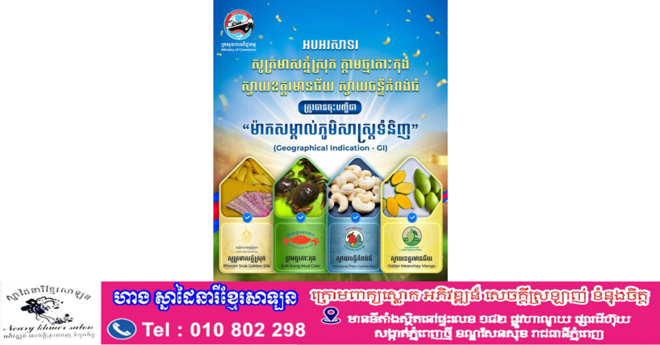 ភ្នំពេញ៖ ក្រសួងពាណិជ្ជកម្មកម្ពុជា នៅថ្ងៃចន្ទទី២៧ ខែមេសា ឆ្នាំ២០២៦នេះ បានឱ្យដឹងថា ក្រសួងពាណិជ្ជកម្ម បានសម្រេចចុះបញ្ជីជាផ្លូវការនូវផលិតផលសក្តានុពលចំនួន ៤ មុខបន្ថែមទៀតដូចជា សូត្រមាសភ្នំស្រុក ក្តាមថ្មកោះកុង ស្វាយចន្ទីកំពង់ធំ និងស្វាយឧត្តរមានជ័យ ជា«ម៉ាកសម្គាល់ភូមិសាស្ត្រទំនិញ (Geographical Indication – GI) » ដែលជាជំហានសំខាន់ក្នុងការជំរុញ ព្រមទាំងលើកកម្ពស់កេរ្តិ៍ឈ្មោះនិងអត្តសញ្ញាណផលិតផលខ្មែរលើឆាកអន្តរជាតិ ការពារសិទ្ធិកម្មសិទ្ធិបញ្ញារបស់សហគមន៍ផលិតករ និងបង្កើនសក្តានុពលសម្រាប់ការចុះបញ្ជីនៅទីផ្សារអន្តរជាតិនាពេលអនាគត។